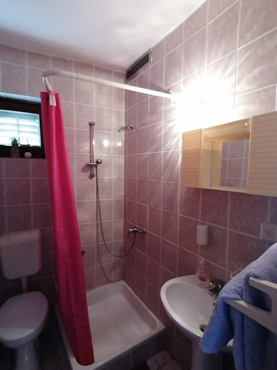 • shower, shower enclosure, hairdryer, towels.