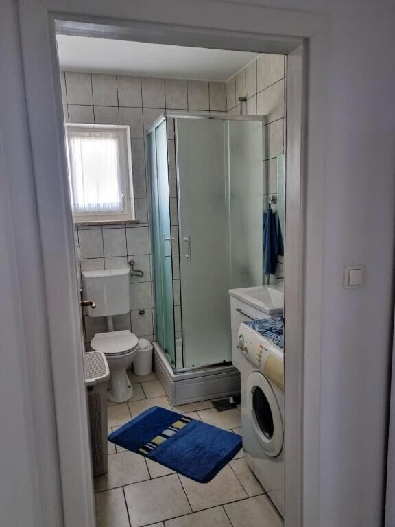 • shower, shower enclosure, washing machine, towels.