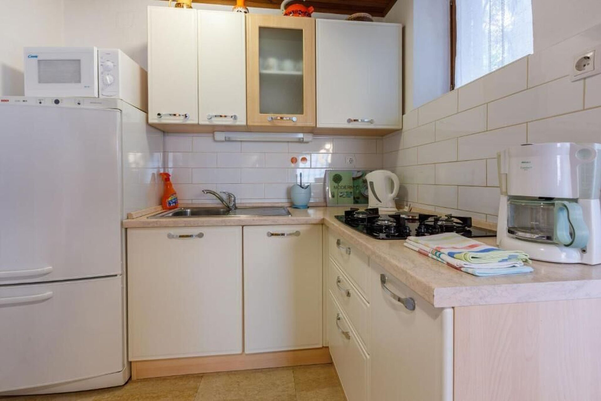 • table and chairs, kitchen sink, oven, refrigerator, upright freezer, electric kettle, filter coffee machine, microwave oven, iron, stove cooktop.