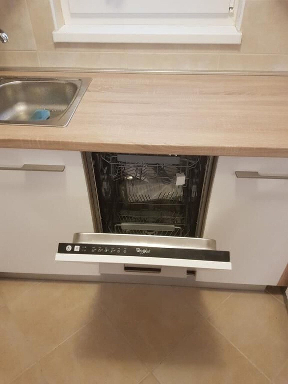 • table and chairs, kitchen sink, oven, refrigerator, upright freezer, electric kettle, filter coffee machine, microwave oven, dishwasher, iron, stove cooktop.