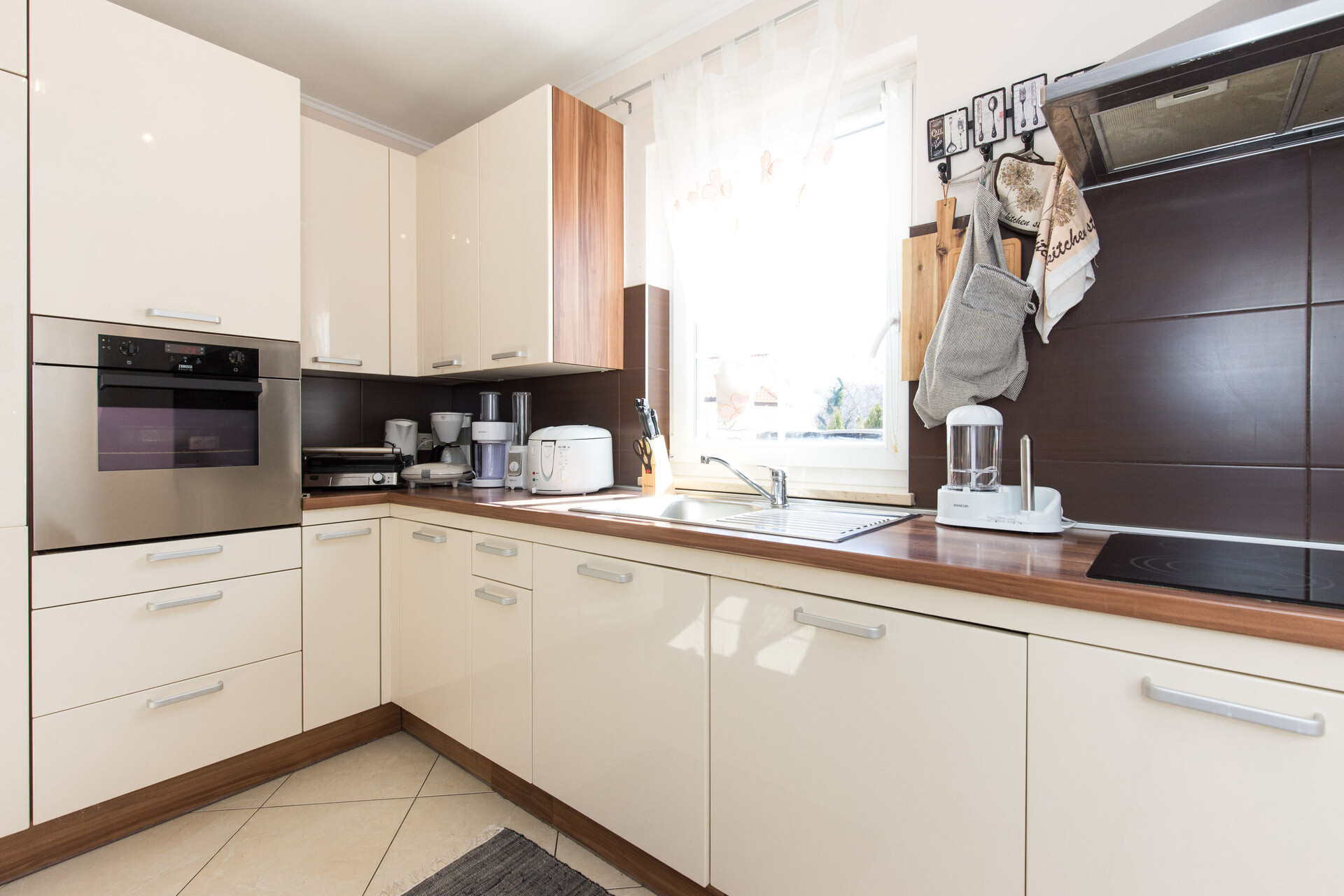 • table and chairs, kitchen sink, oven, refrigerator, upright freezer, electric kettle, filter coffee machine, microwave oven, toaster, dishwasher, iron, stove cooktop.