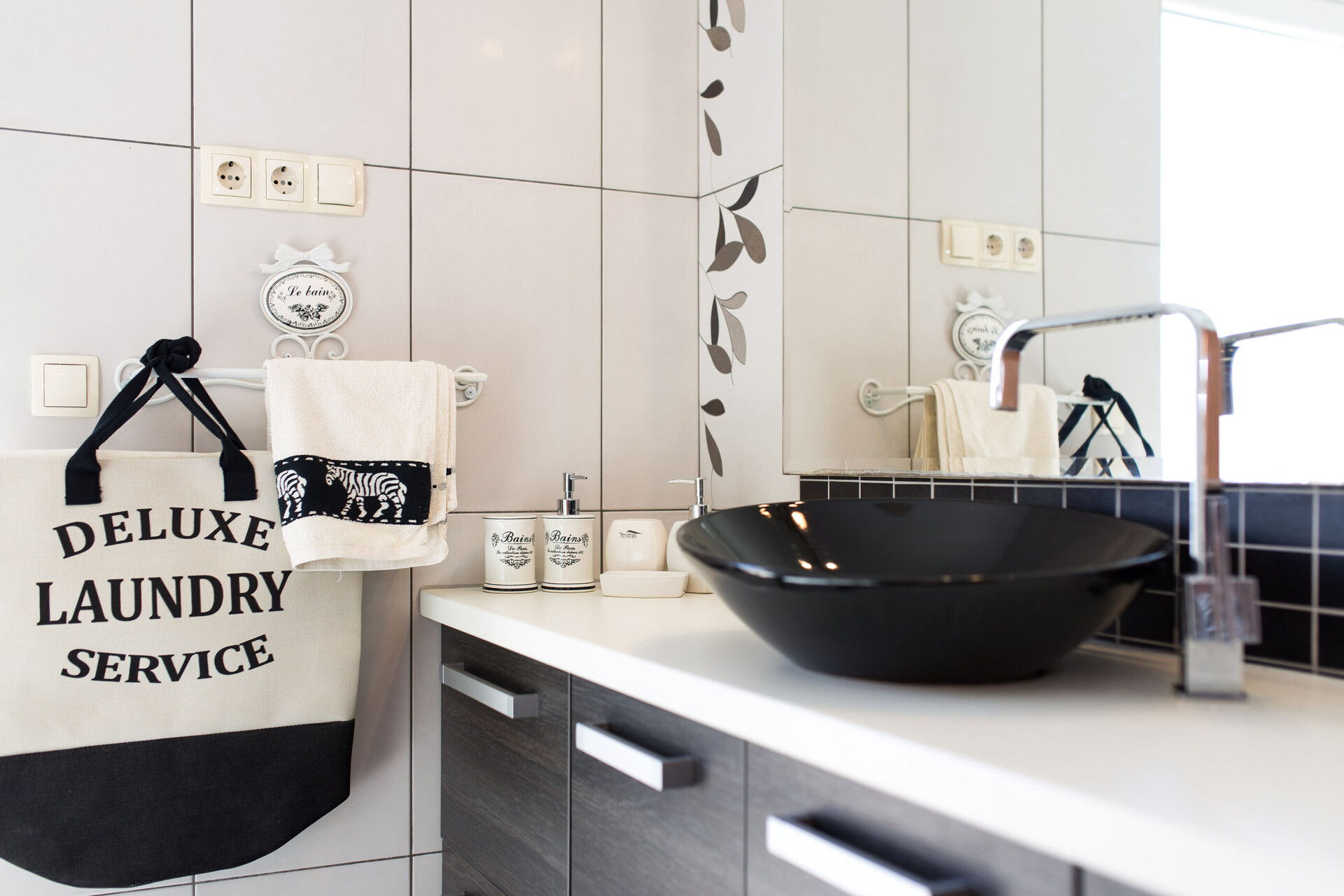 • shower, shower enclosure, washing machine, hairdryer, towels.