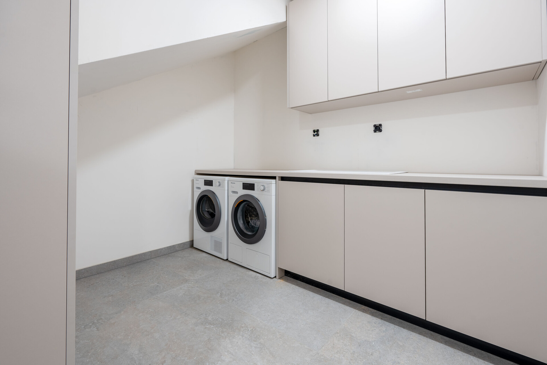 • shower, shower enclosure, washing machine, hairdryer, towels.