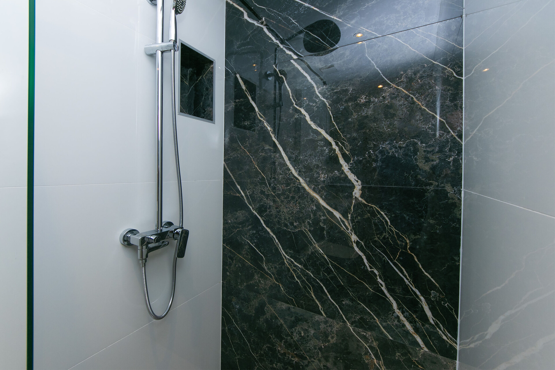 • shower, shower enclosure, hairdryer, towels.