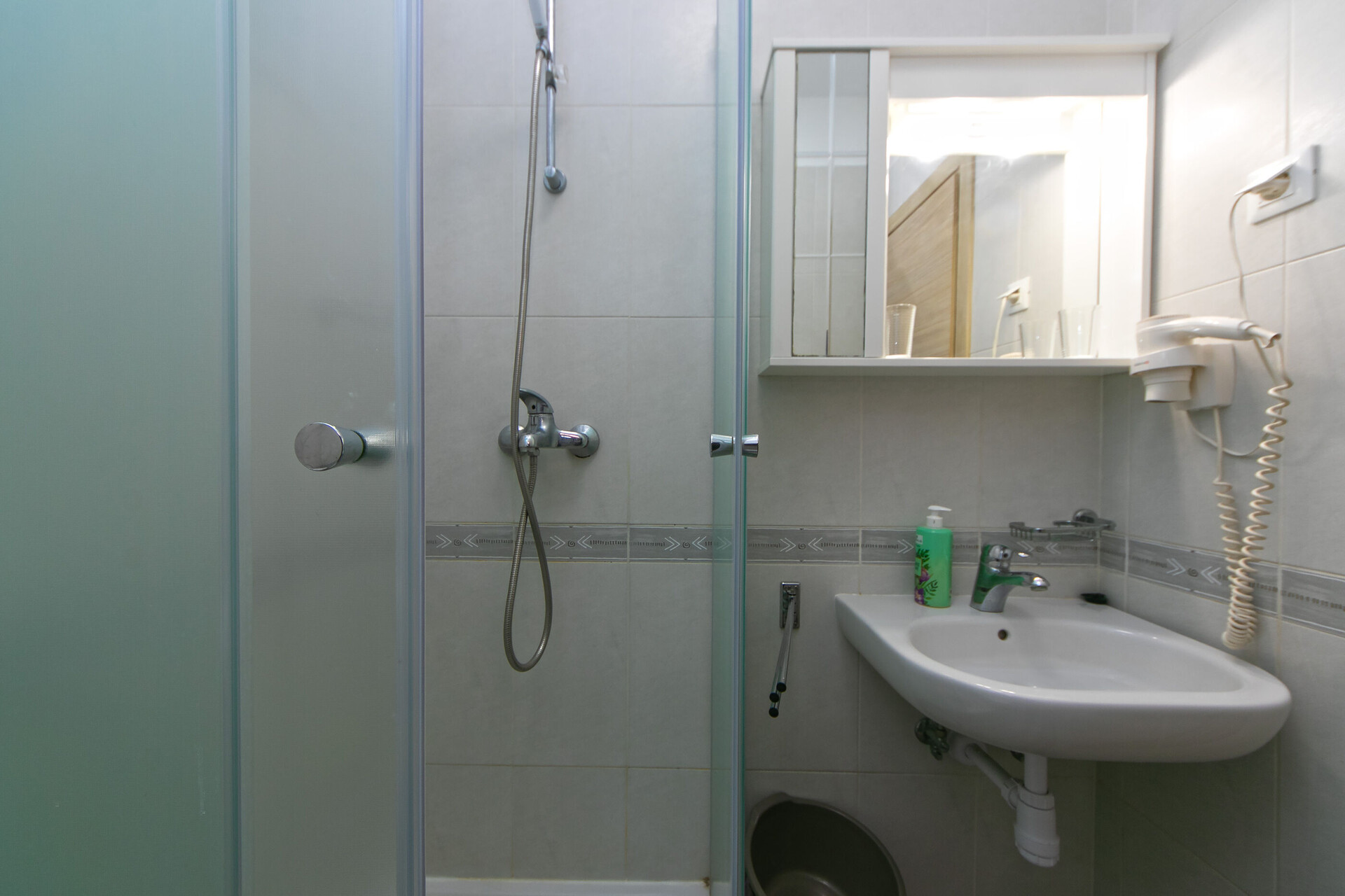 • shower, shower enclosure, towels.