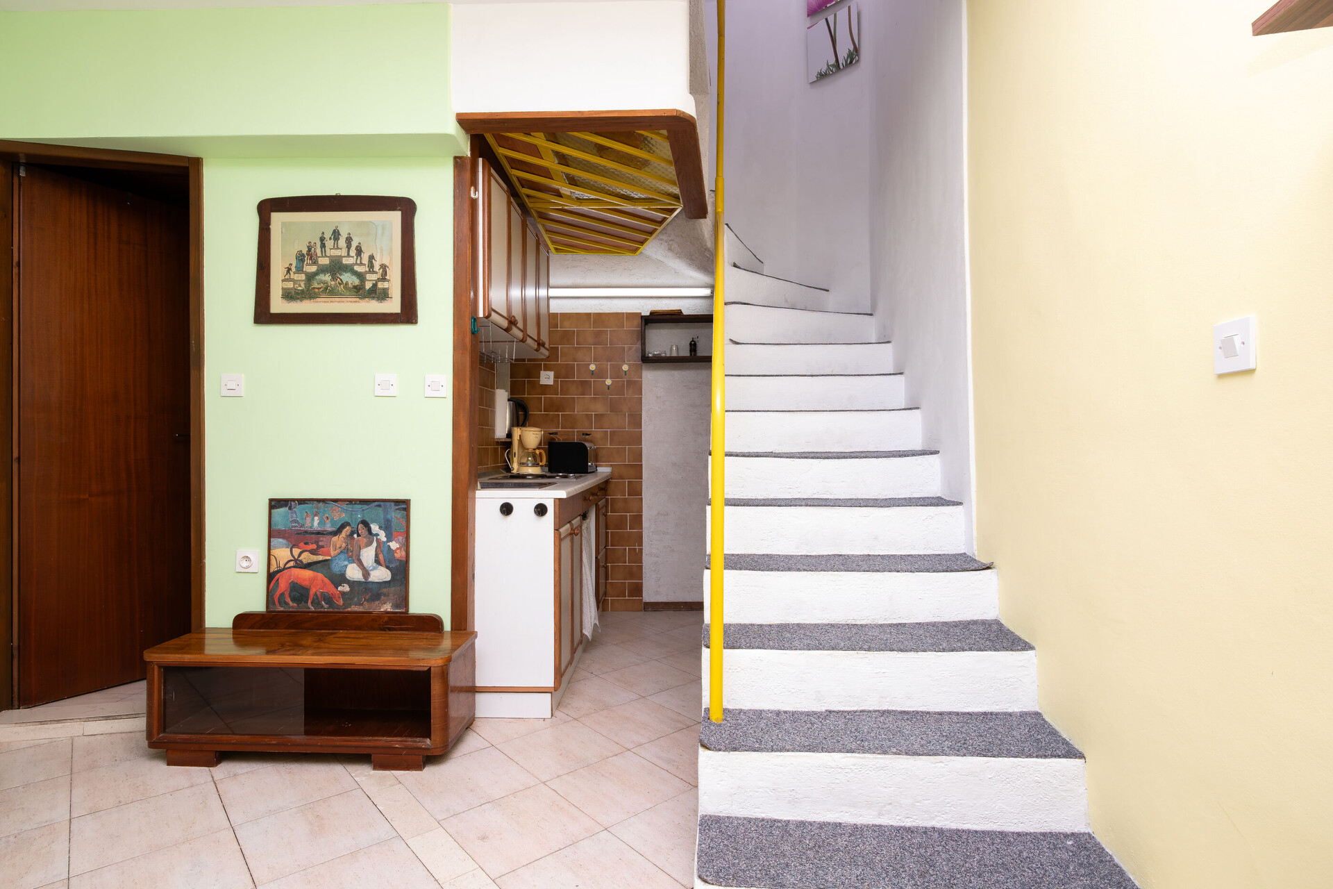 • table and chairs, kitchen sink, refrigerator, electric kettle, filter coffee machine, microwave oven, toaster, stove cooktop.