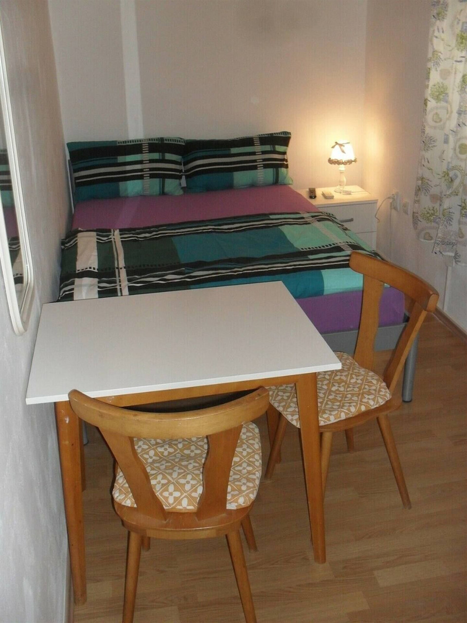 • table and chairs, kitchen sink, oven, refrigerator, upright freezer, electric kettle, filter coffee machine, microwave oven, toaster, iron, stove cooktop.