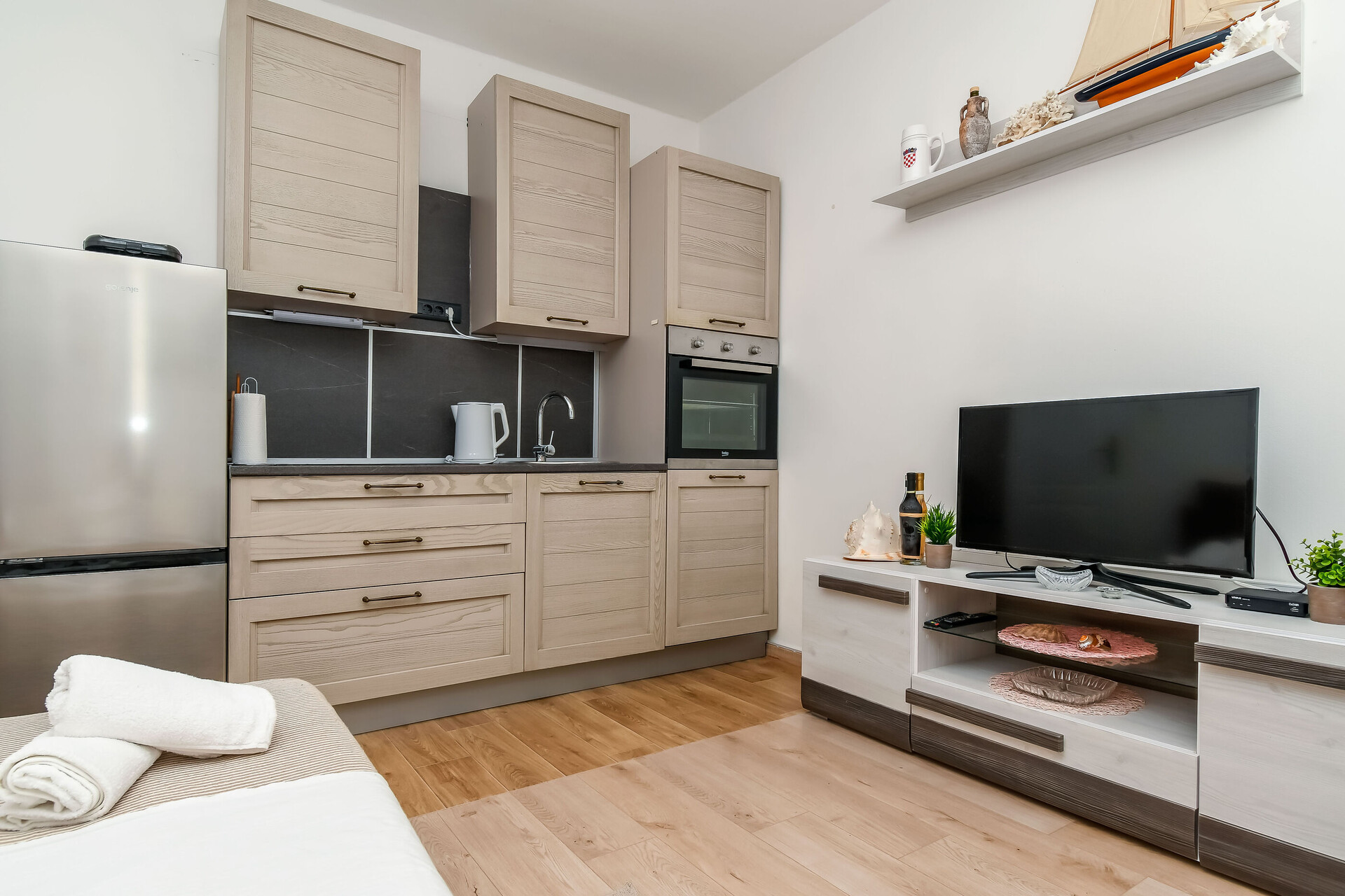 • table and chairs, kitchen sink, oven, refrigerator, upright freezer, electric kettle, filter coffee machine, toaster, dishwasher, iron, stove cooktop.