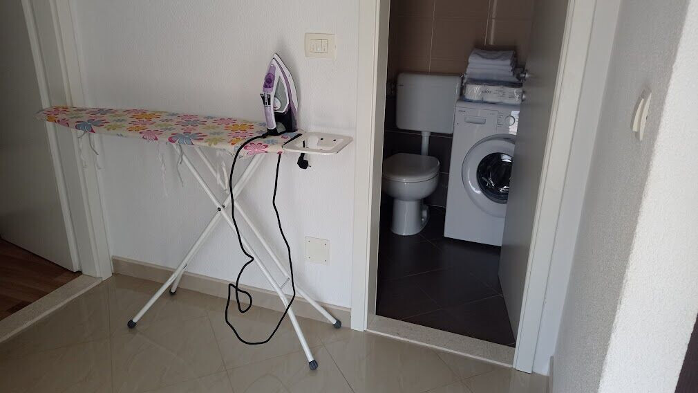 • shower, shower enclosure, washing machine, hairdryer, towels.