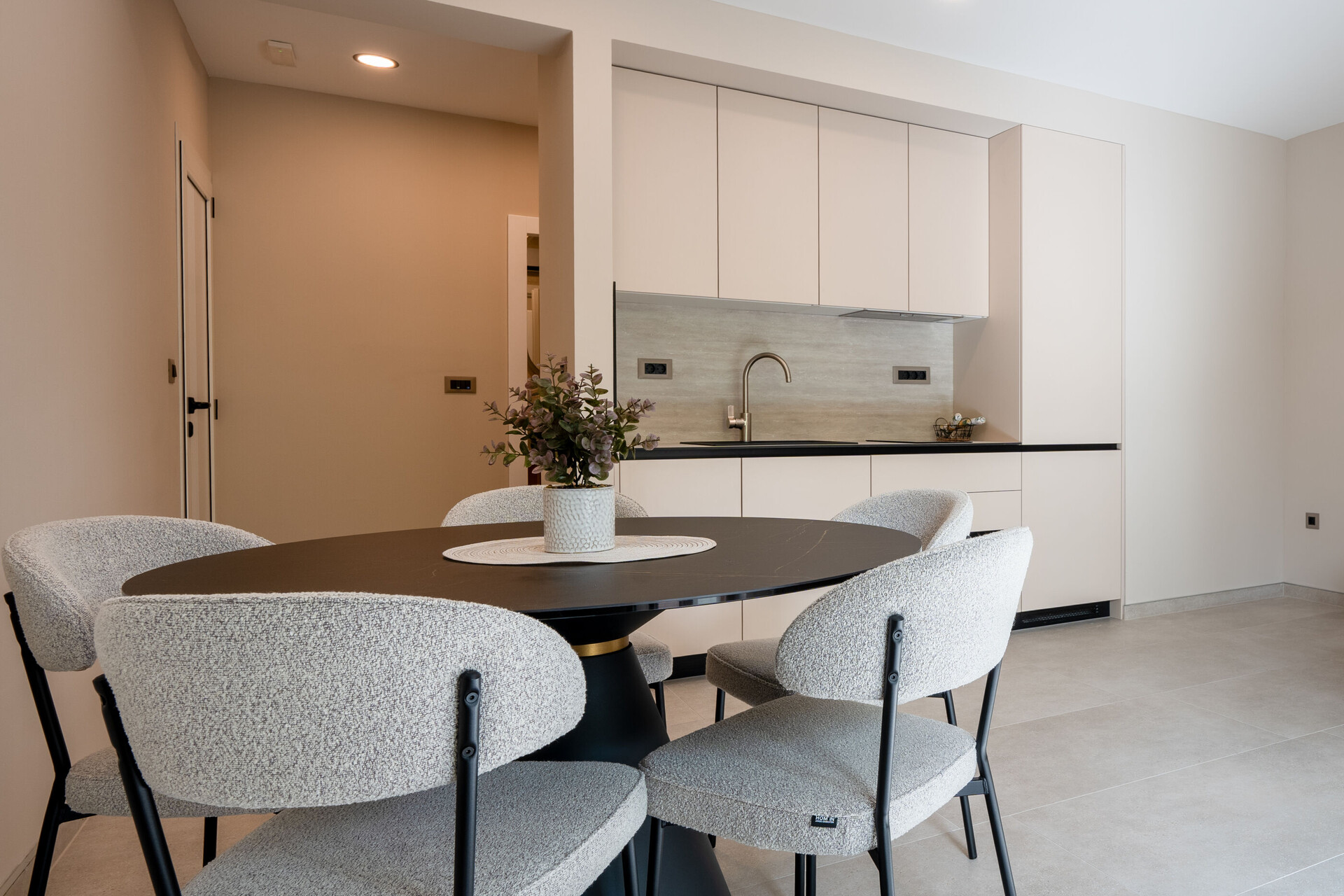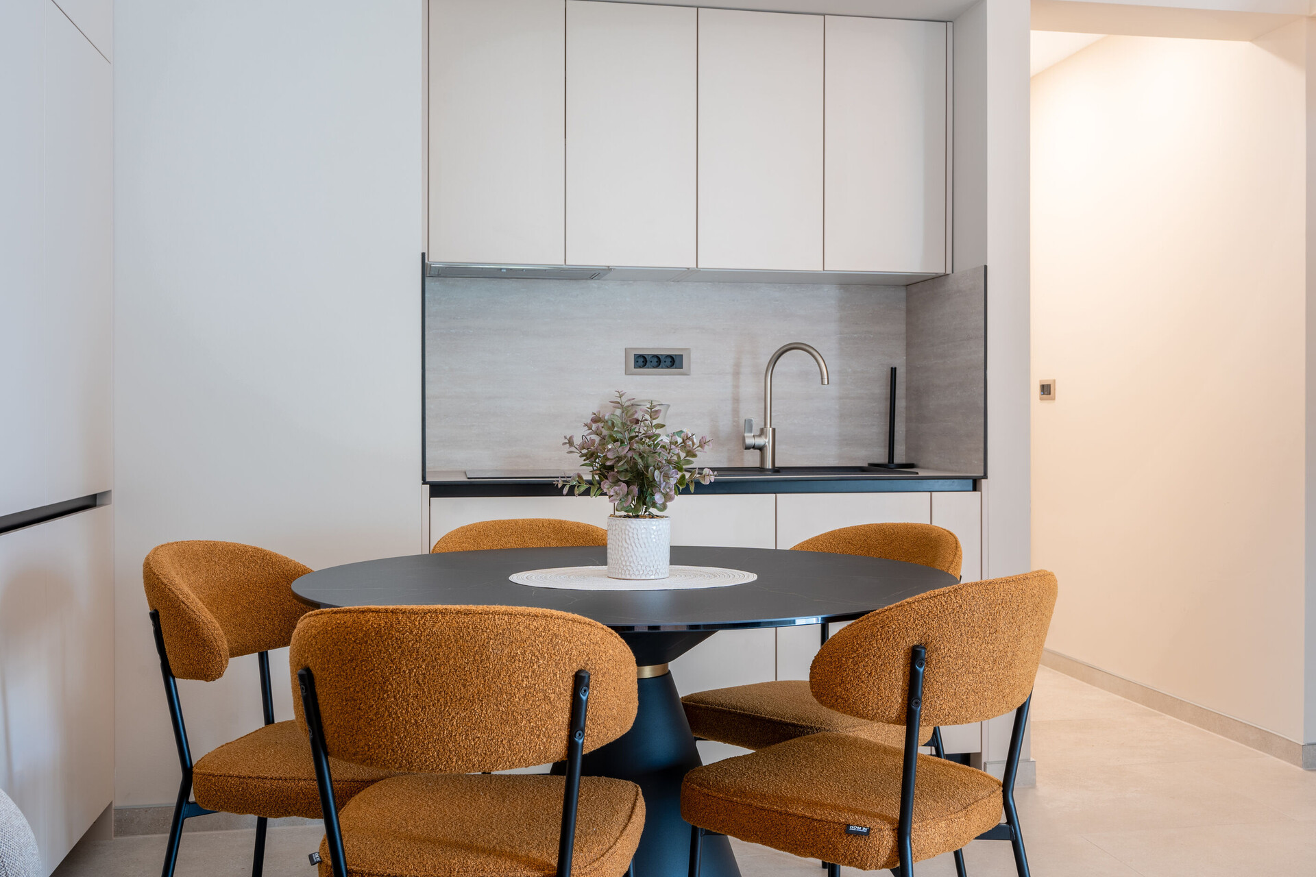 • table and chairs, kitchen sink, refrigerator, filter coffee machine, microwave oven, stove cooktop.