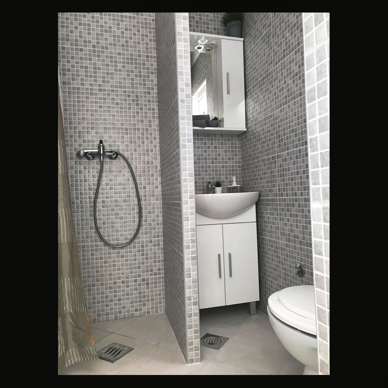 • shower, shower enclosure, washing machine, hairdryer, towels.