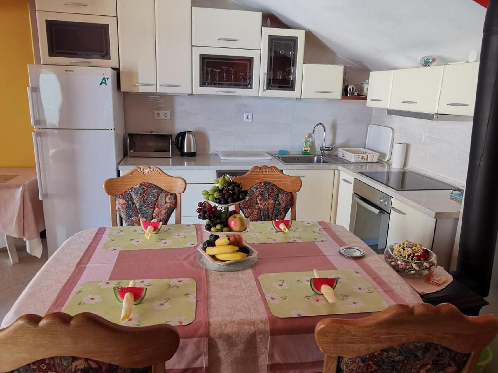 • table and chairs, kitchen sink, oven, refrigerator, electric kettle, filter coffee machine, dishwasher, stove cooktop.