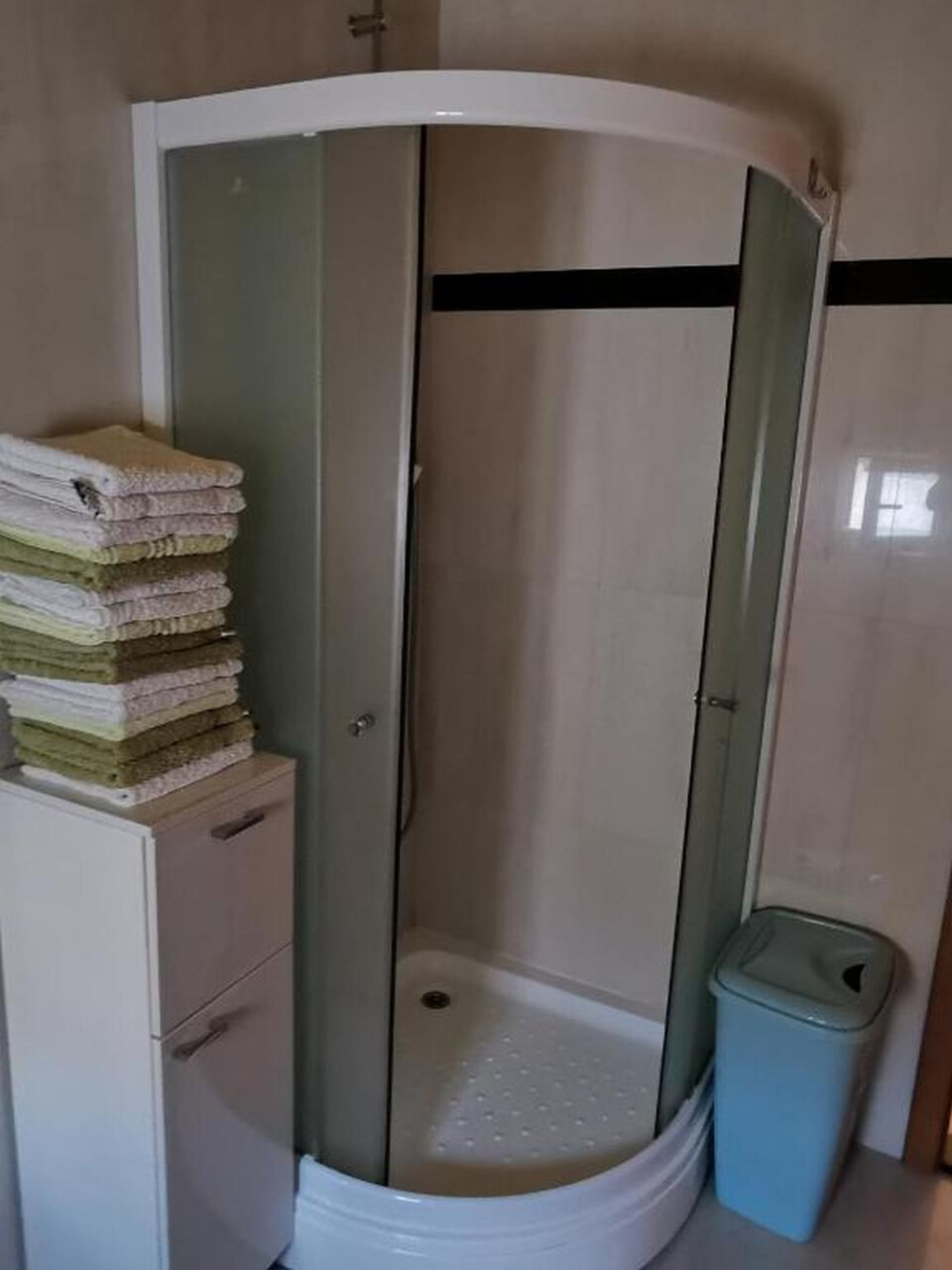 • shower, shower enclosure, hairdryer, towels.