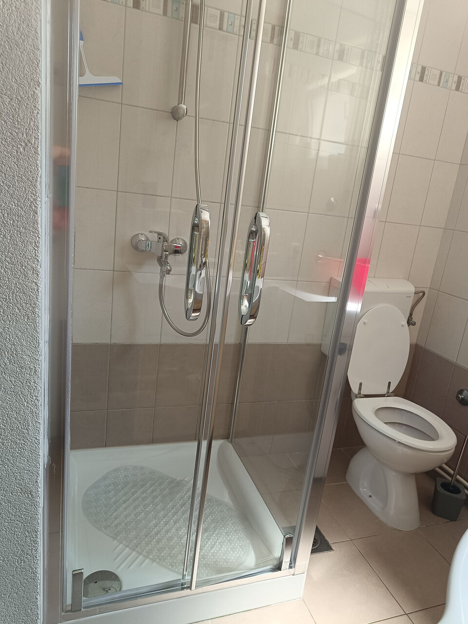 • shower, shower enclosure, towels.