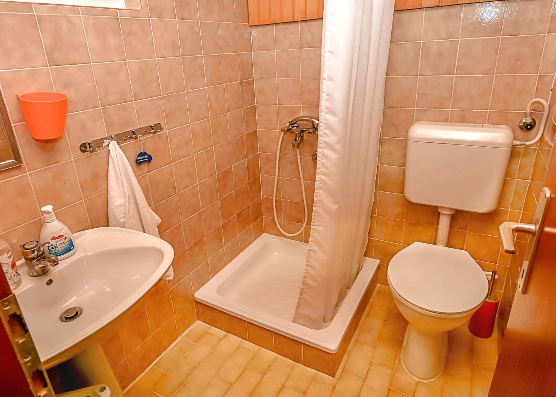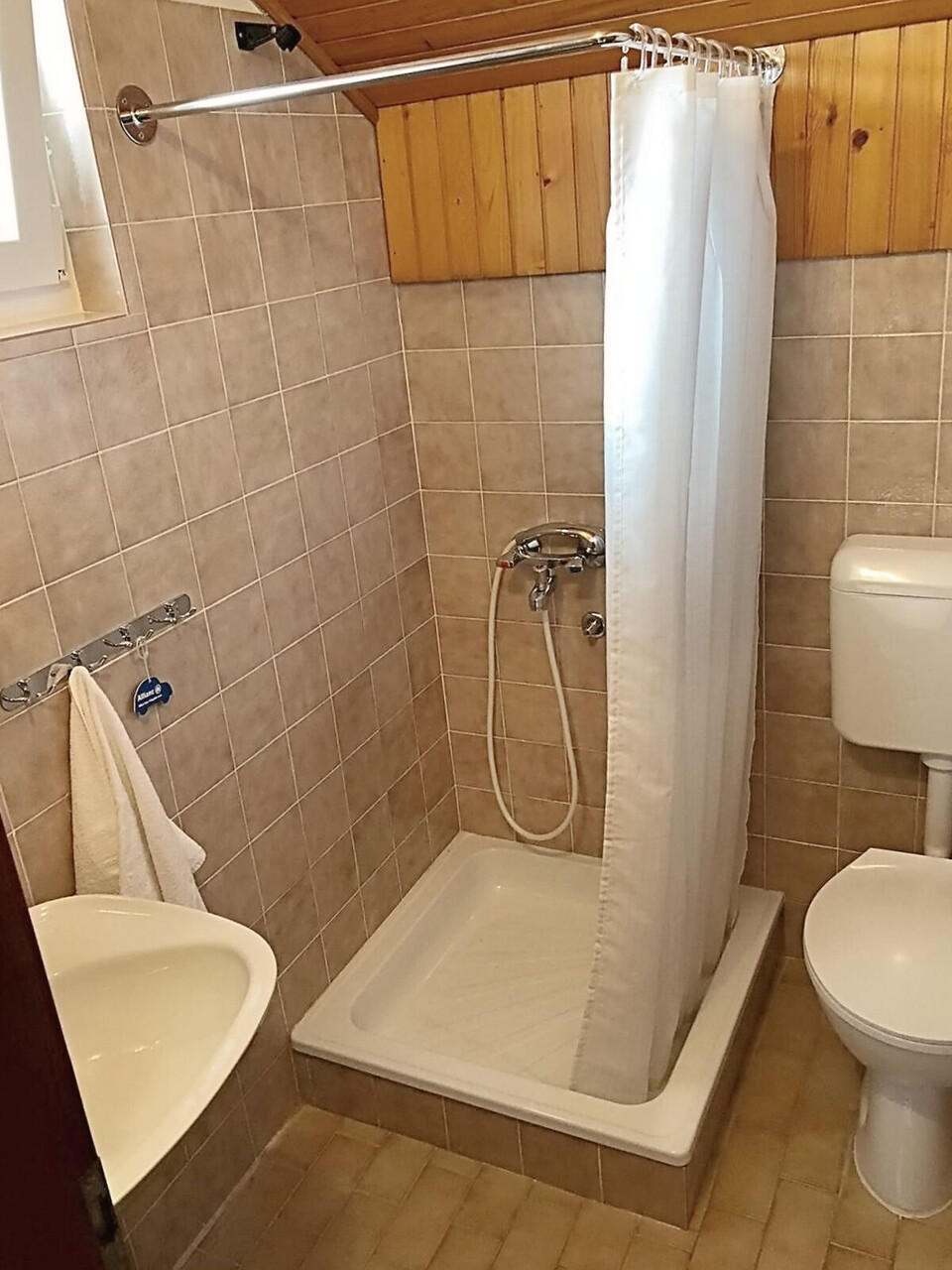• shower, shower enclosure, hairdryer, towels.