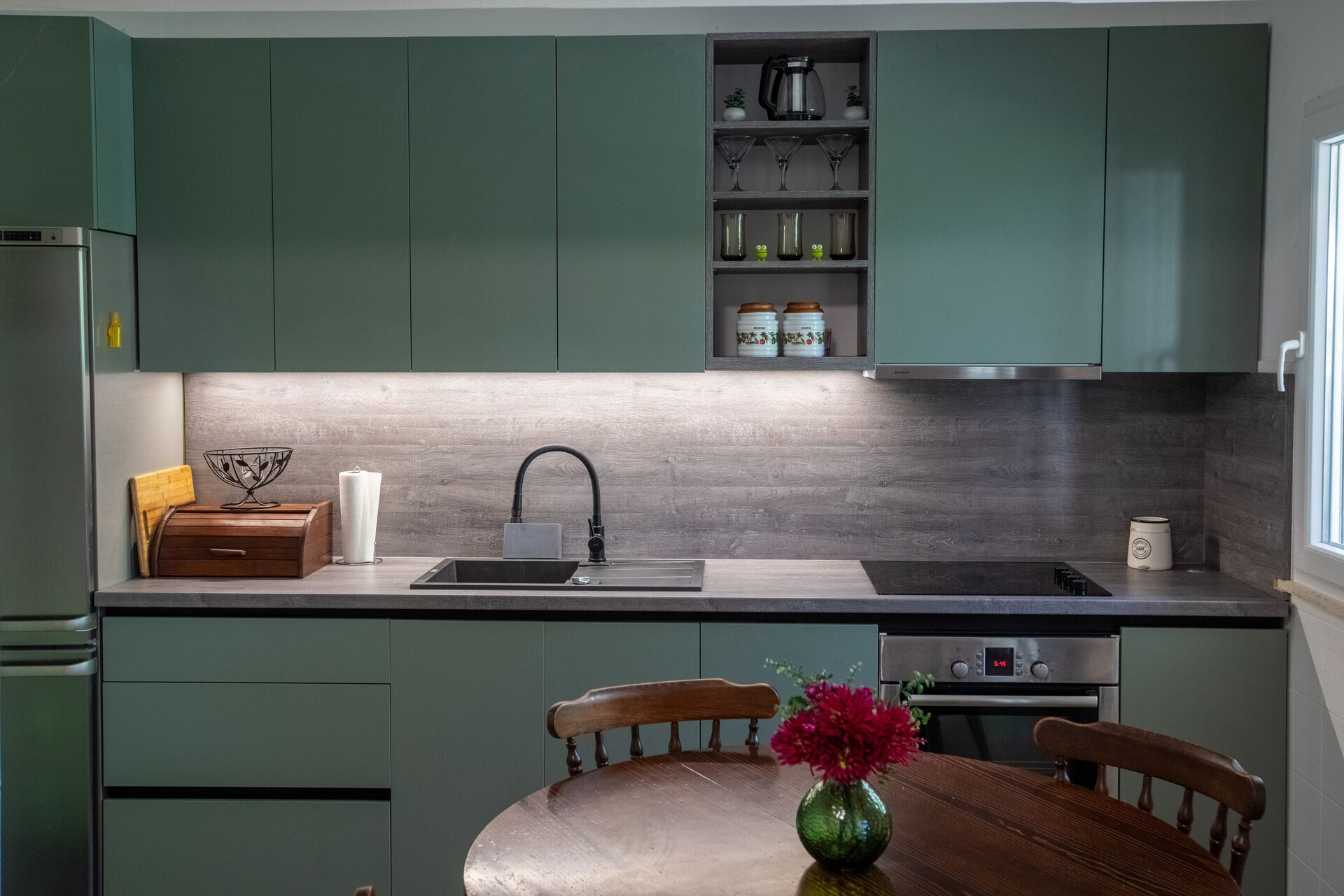 • table and chairs, kitchen sink, oven, refrigerator, upright freezer, electric kettle, filter coffee machine, toaster, dishwasher, stove cooktop.