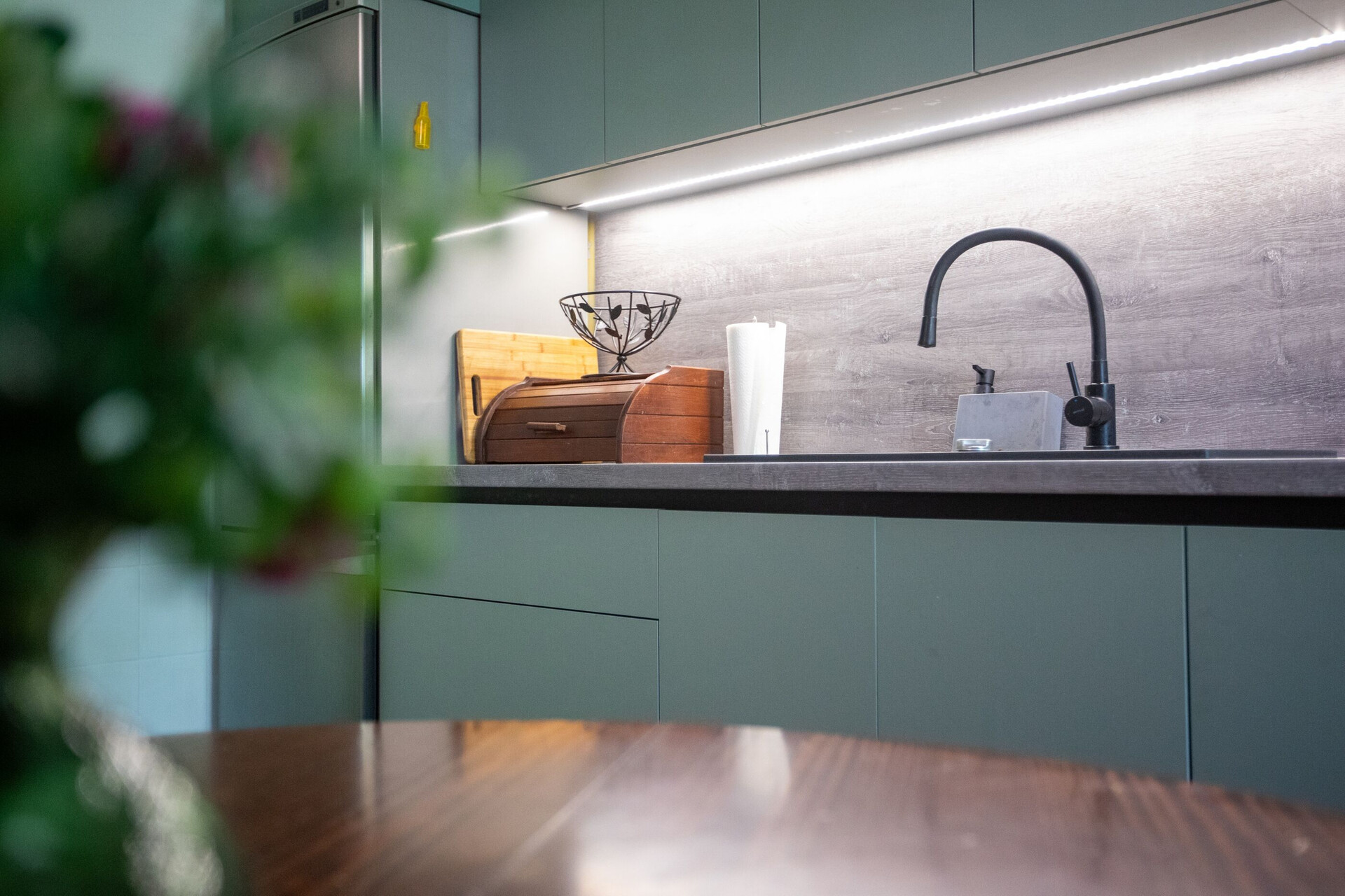 • table and chairs, kitchen sink, oven, refrigerator, upright freezer, electric kettle, filter coffee machine, dishwasher, stove cooktop.
