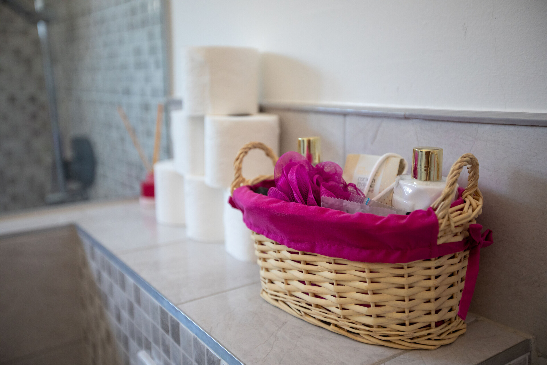 • shower, shower enclosure, washing machine, hairdryer, towels.