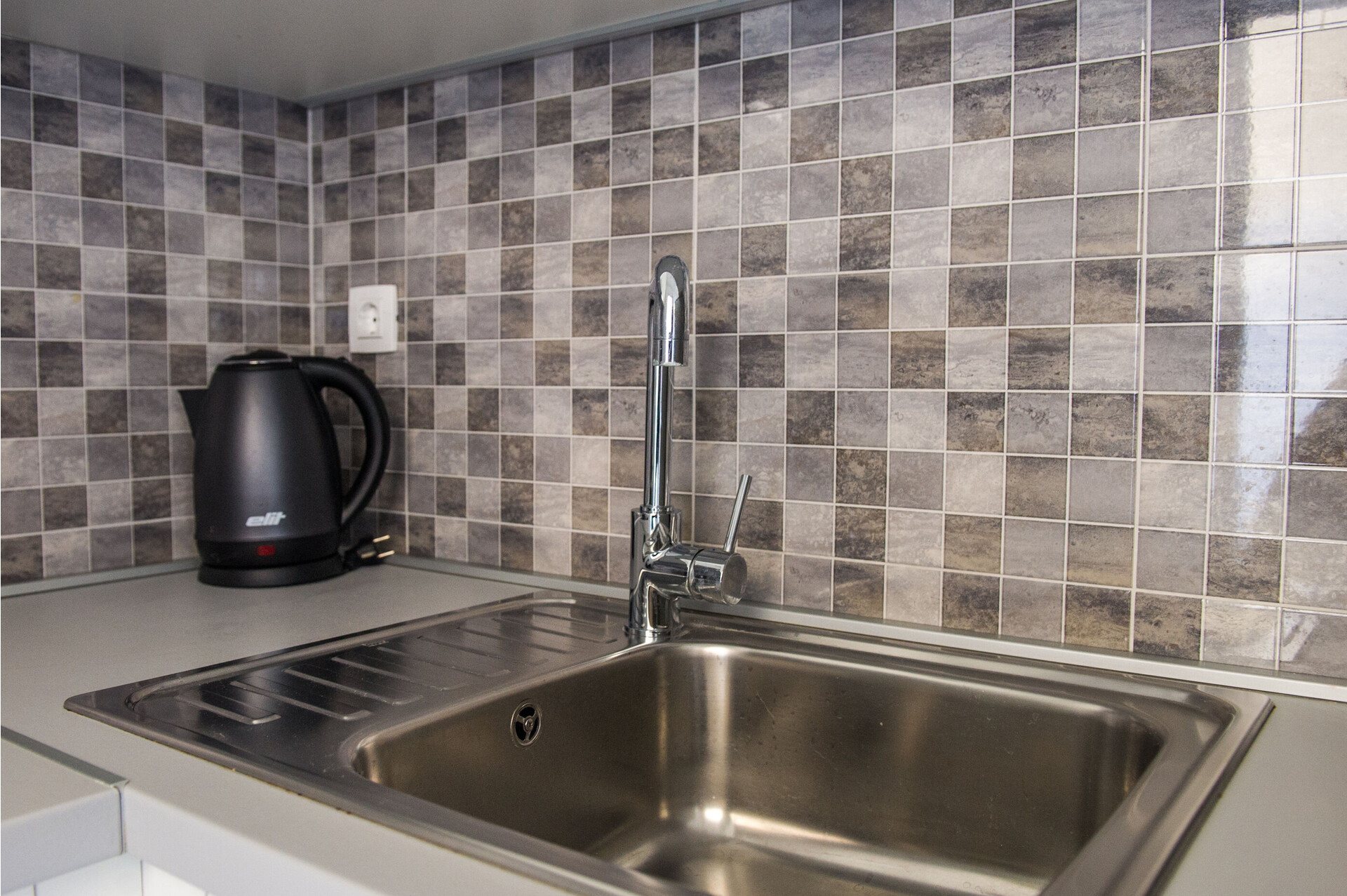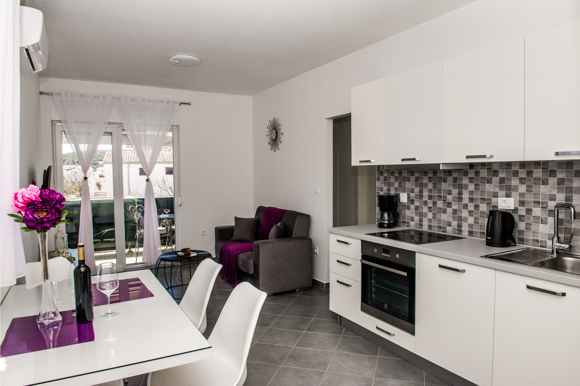 • table and chairs, kitchen sink, refrigerator, upright freezer, electric kettle, filter coffee machine, microwave oven, iron, stove cooktop.