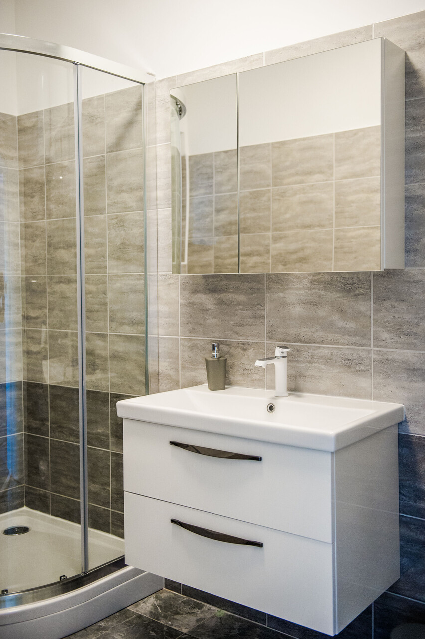 • shower, shower enclosure, hairdryer, towels.