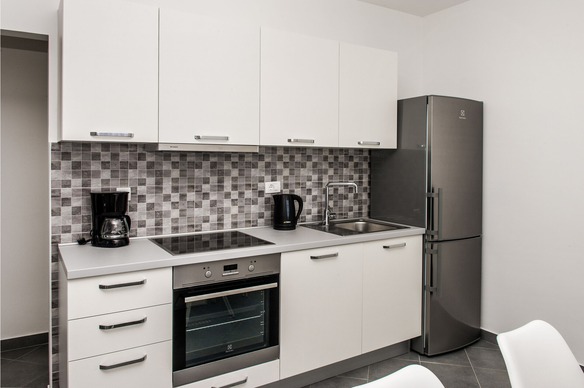• table and chairs, kitchen sink, oven, refrigerator, upright freezer, electric kettle, filter coffee machine, dishwasher, iron, stove cooktop.