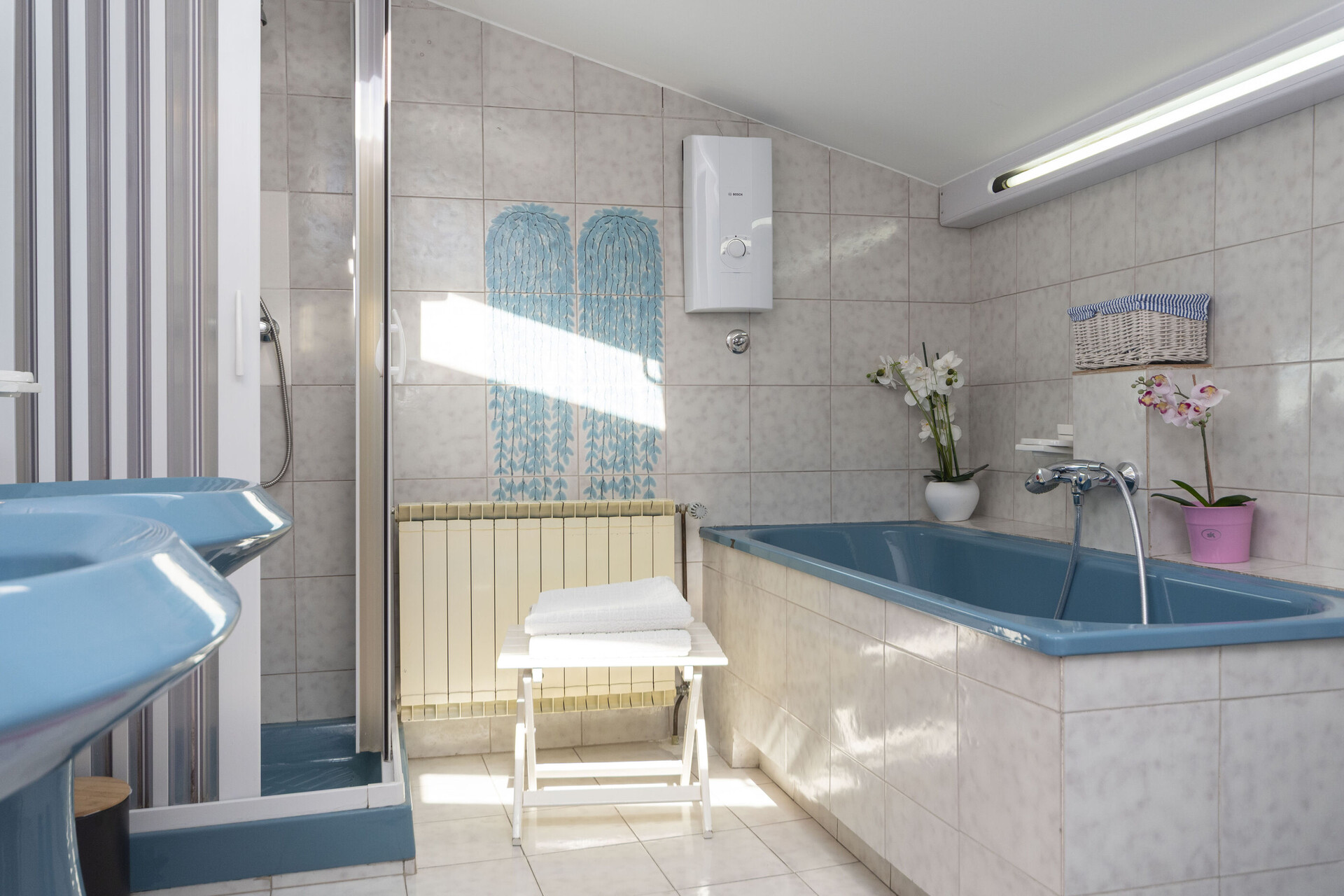 • shower, shower enclosure, washing machine, hairdryer, towels.