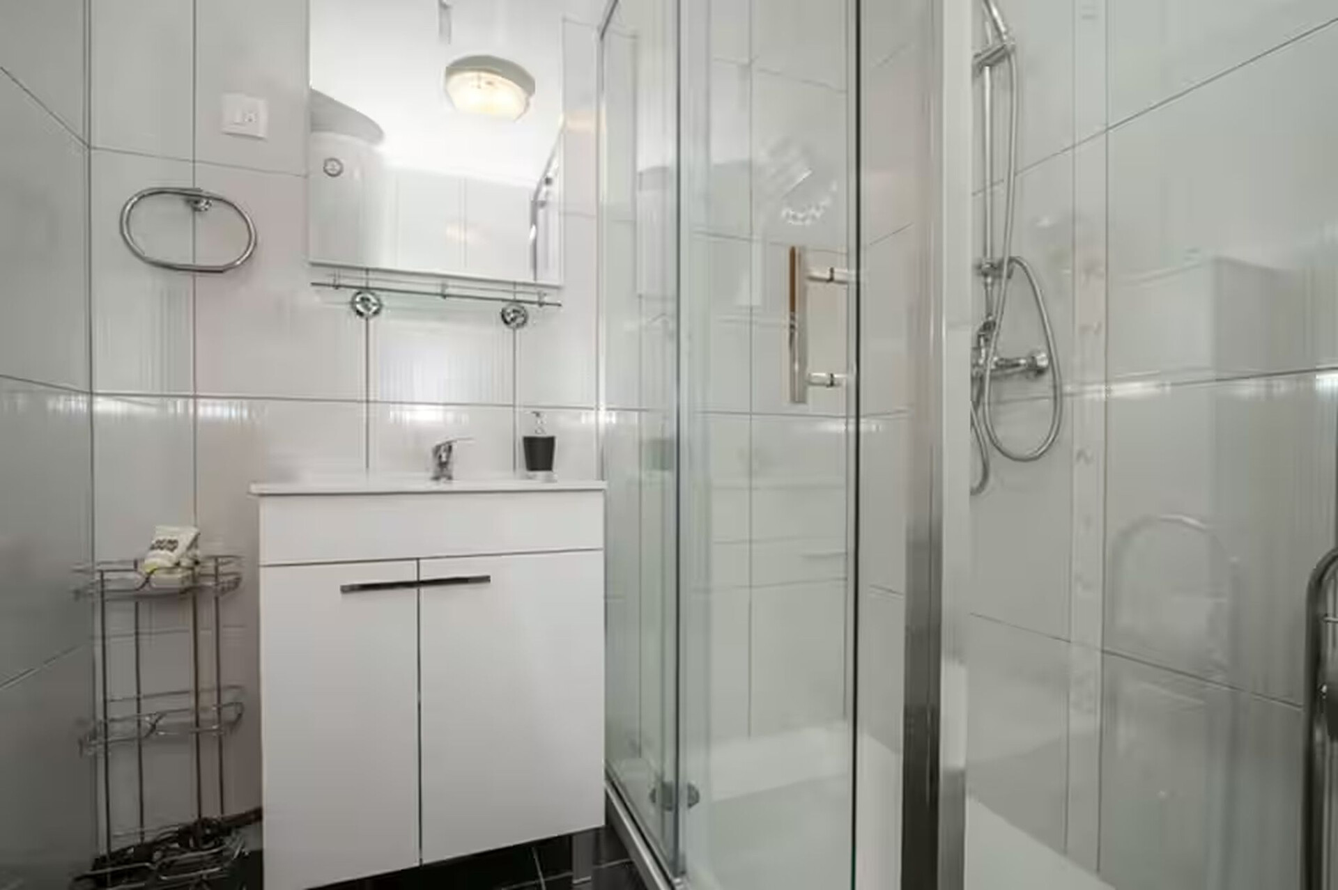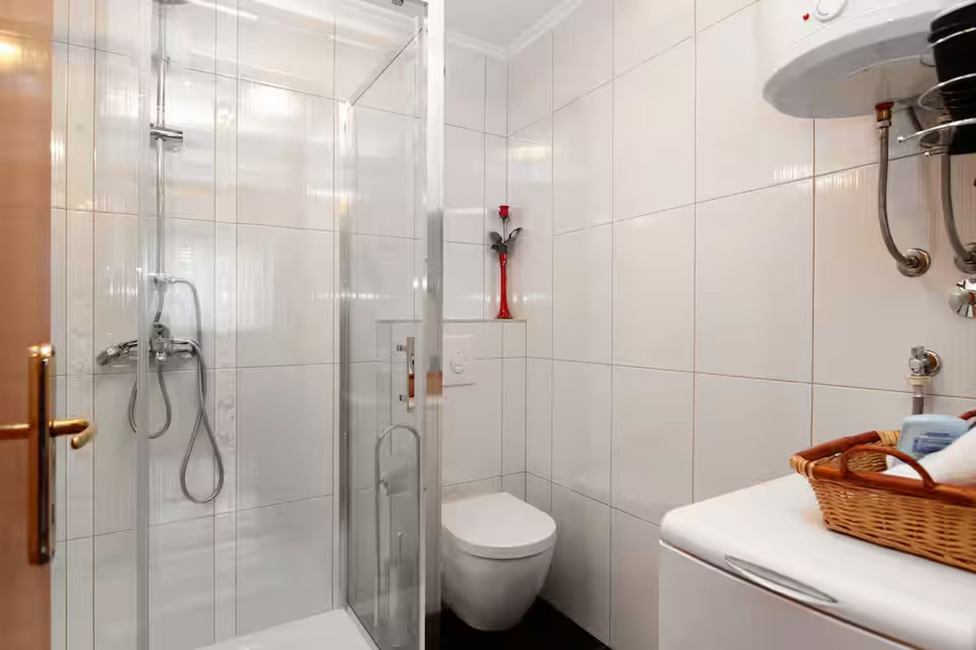 • shower, shower enclosure, washing machine, hairdryer, towels.