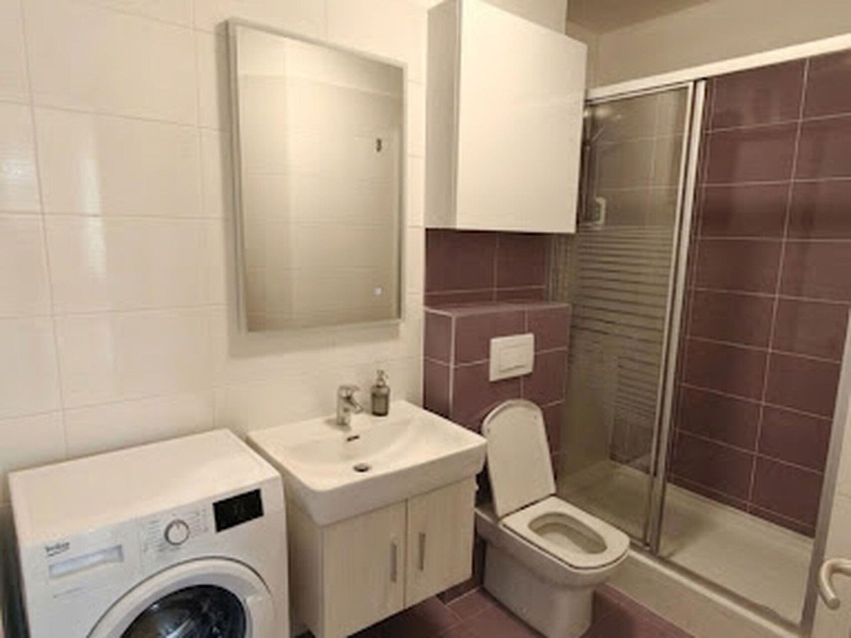 • shower, shower enclosure, washing machine, hairdryer, towels.