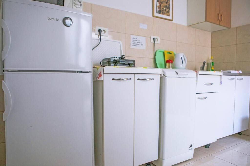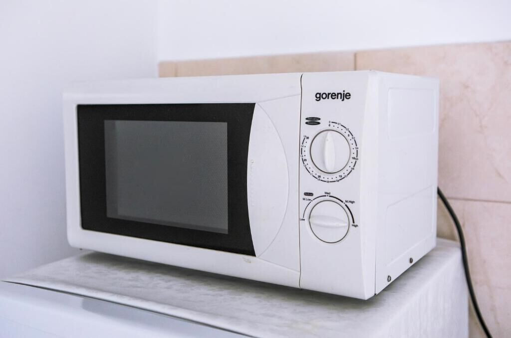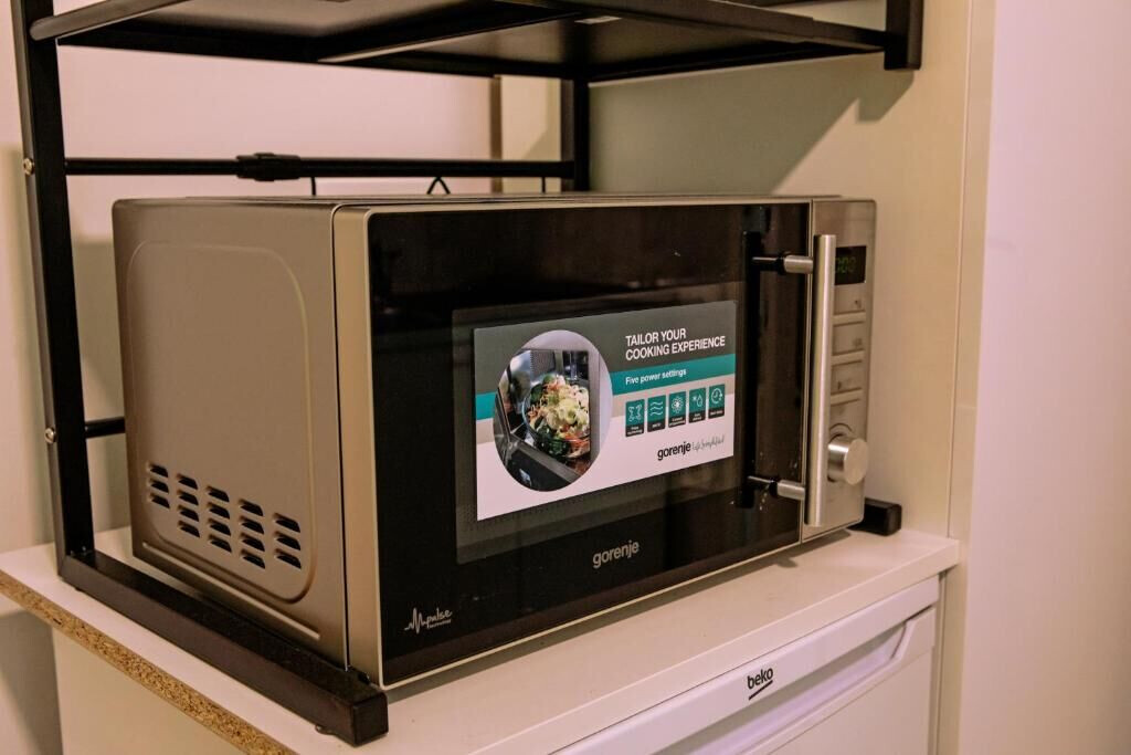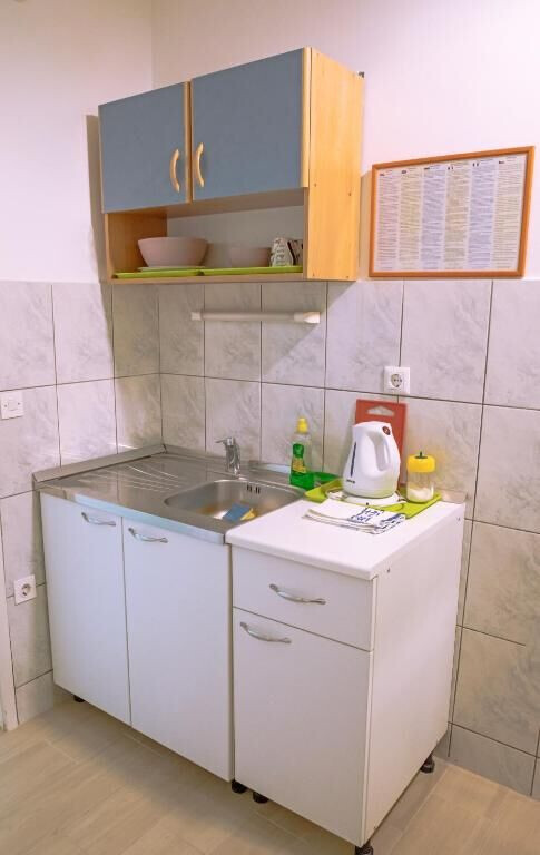 • table and chairs, kitchen sink, refrigerator, electric kettle, filter coffee machine, microwave oven, iron.