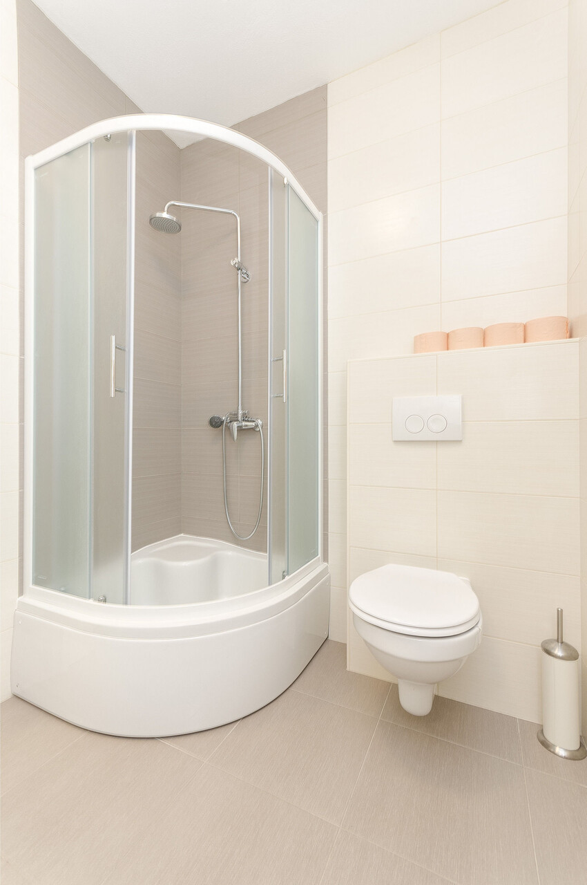 • shower, shower enclosure, hairdryer, towels.
