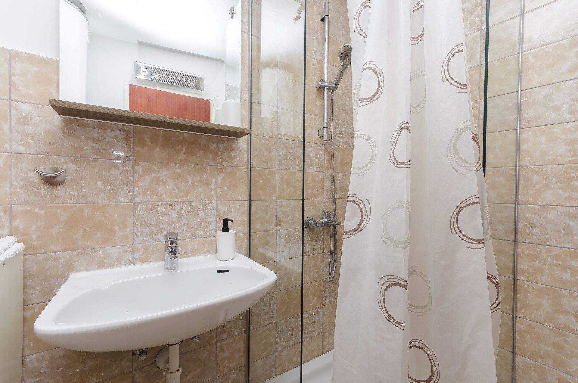 • shower, shower enclosure, washing machine, hairdryer, towels.