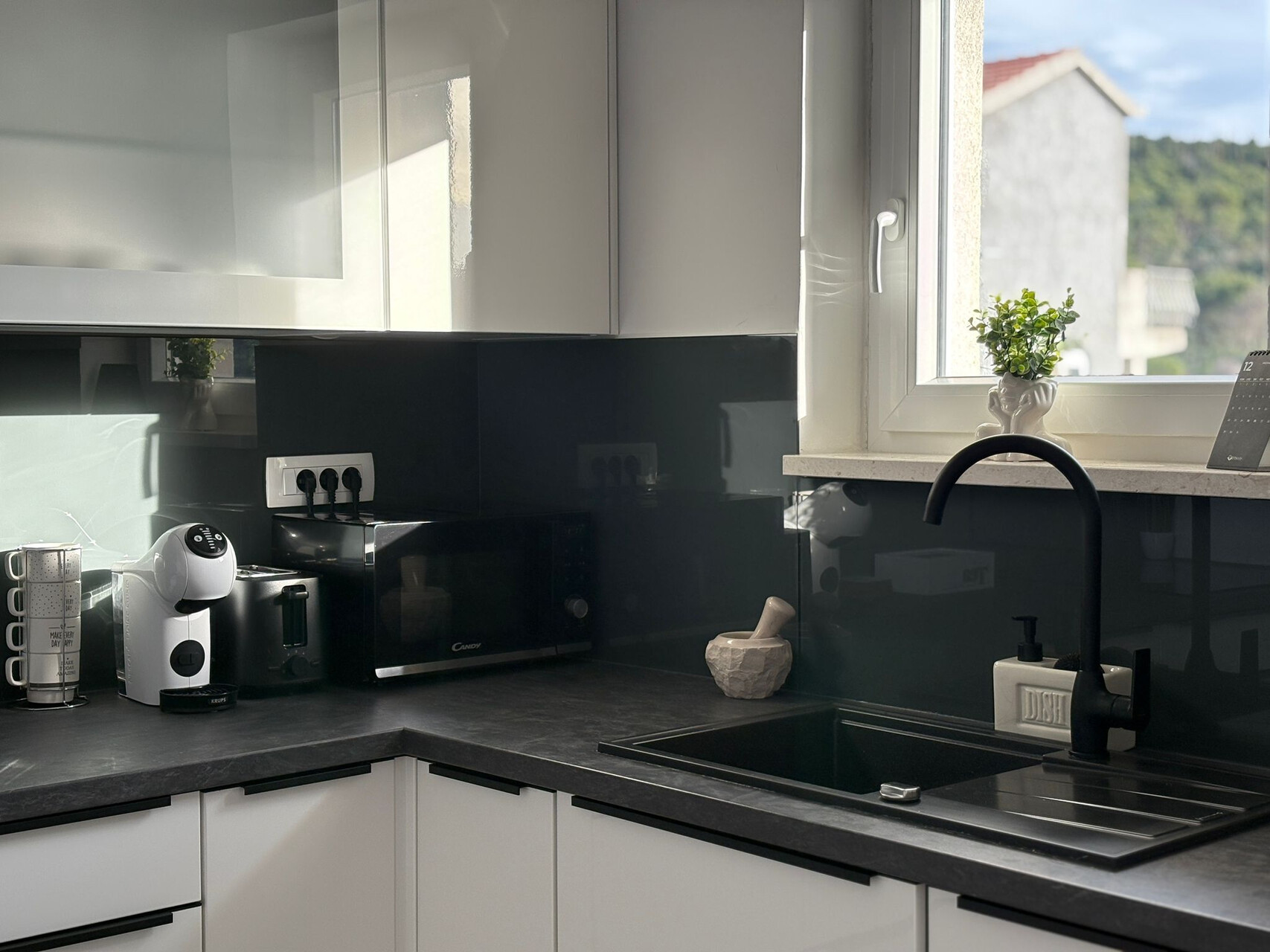 • table and chairs, kitchen sink, oven, refrigerator, upright freezer, electric kettle, filter coffee machine, toaster, dishwasher, iron, stove cooktop.
