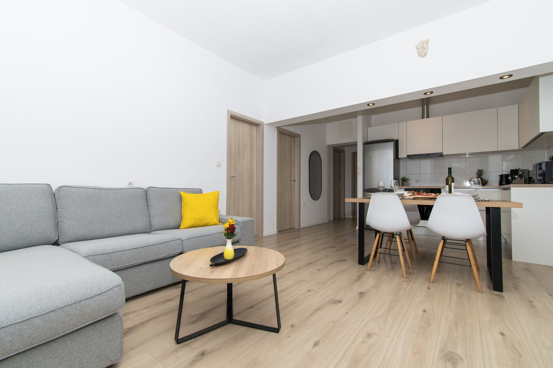 • table and chairs, kitchen sink, oven, refrigerator, upright freezer, electric kettle, filter coffee machine, microwave oven, toaster, dishwasher, iron, stove cooktop.