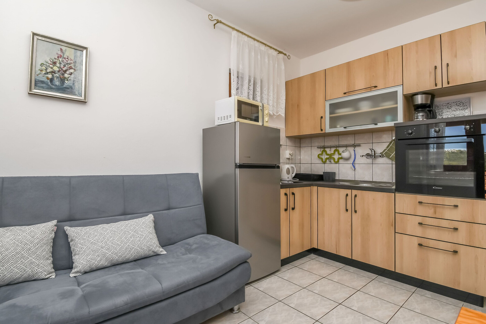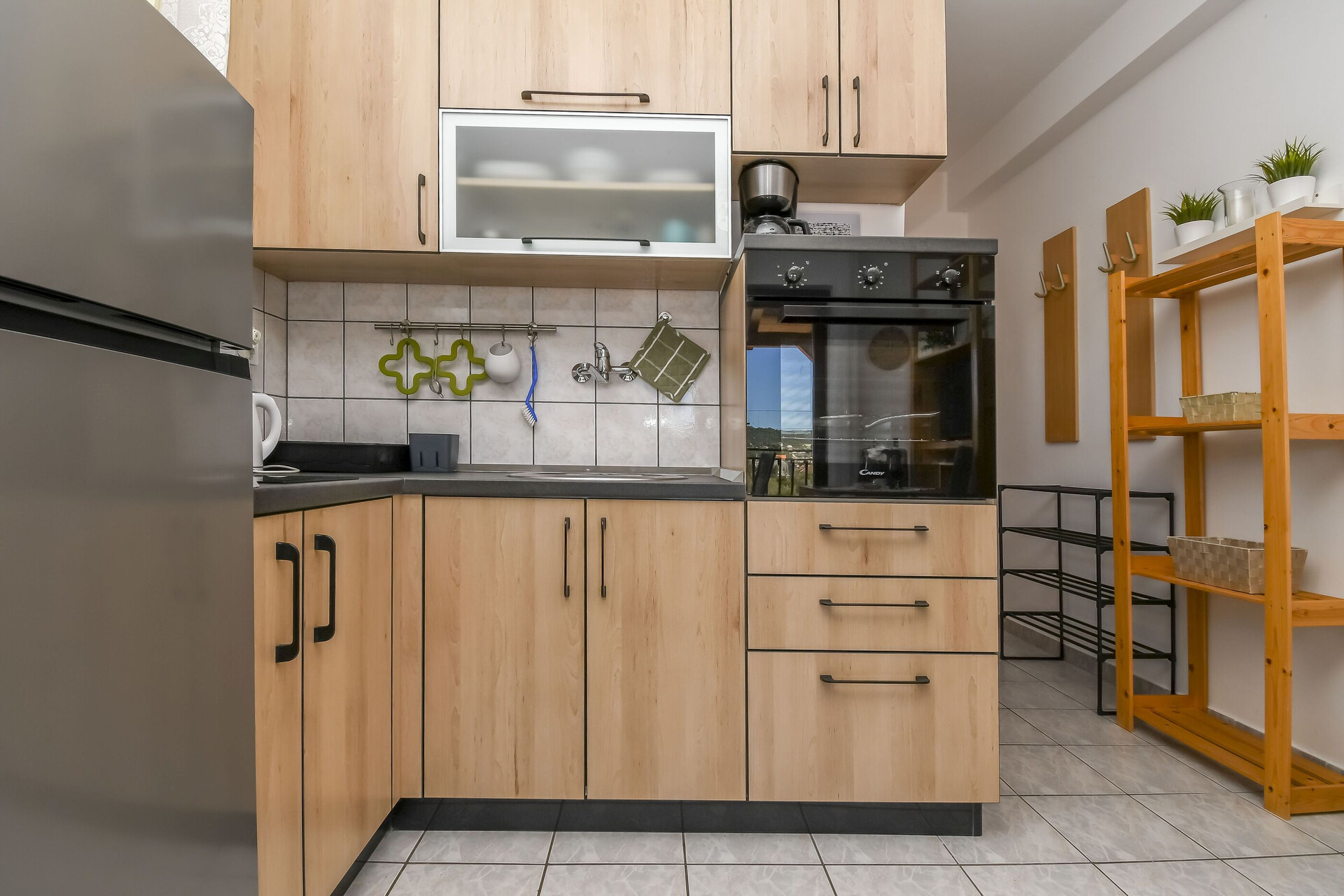 • table and chairs, kitchen sink, oven, refrigerator, filter coffee machine, toaster, stove cooktop.