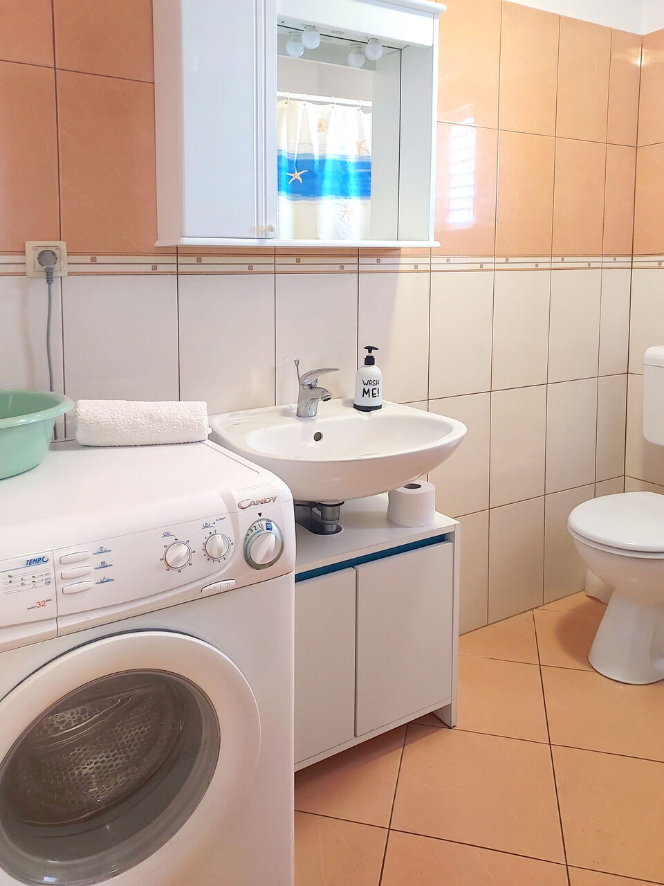 • shower, shower enclosure, washing machine, hairdryer, towels.