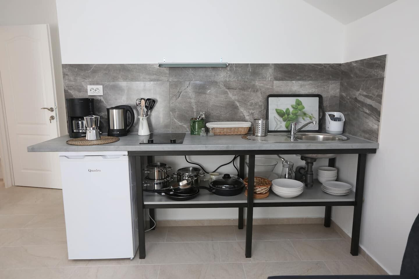 • table and chairs, kitchen sink, refrigerator, upright freezer, electric kettle, filter coffee machine, iron, stove cooktop.