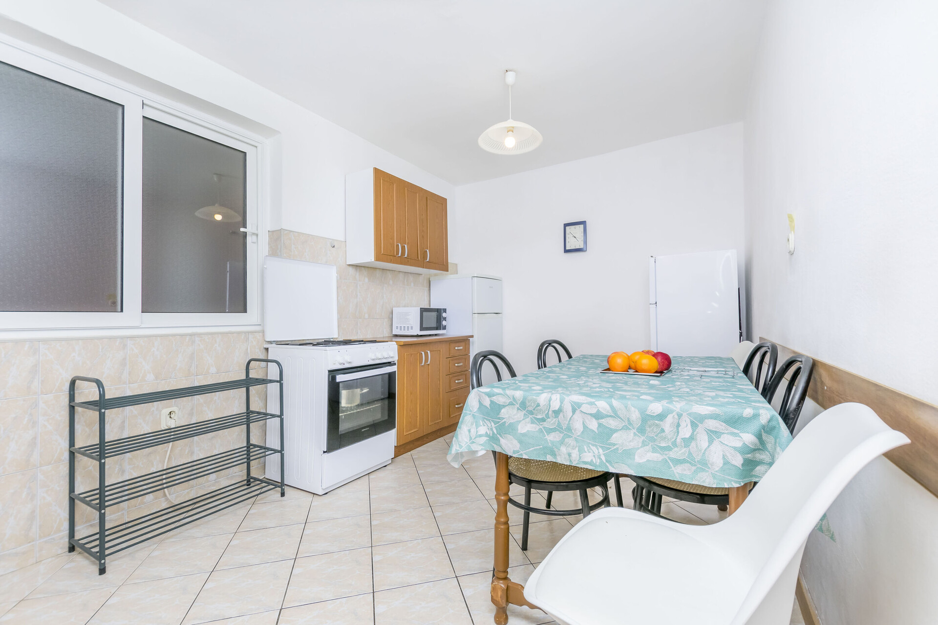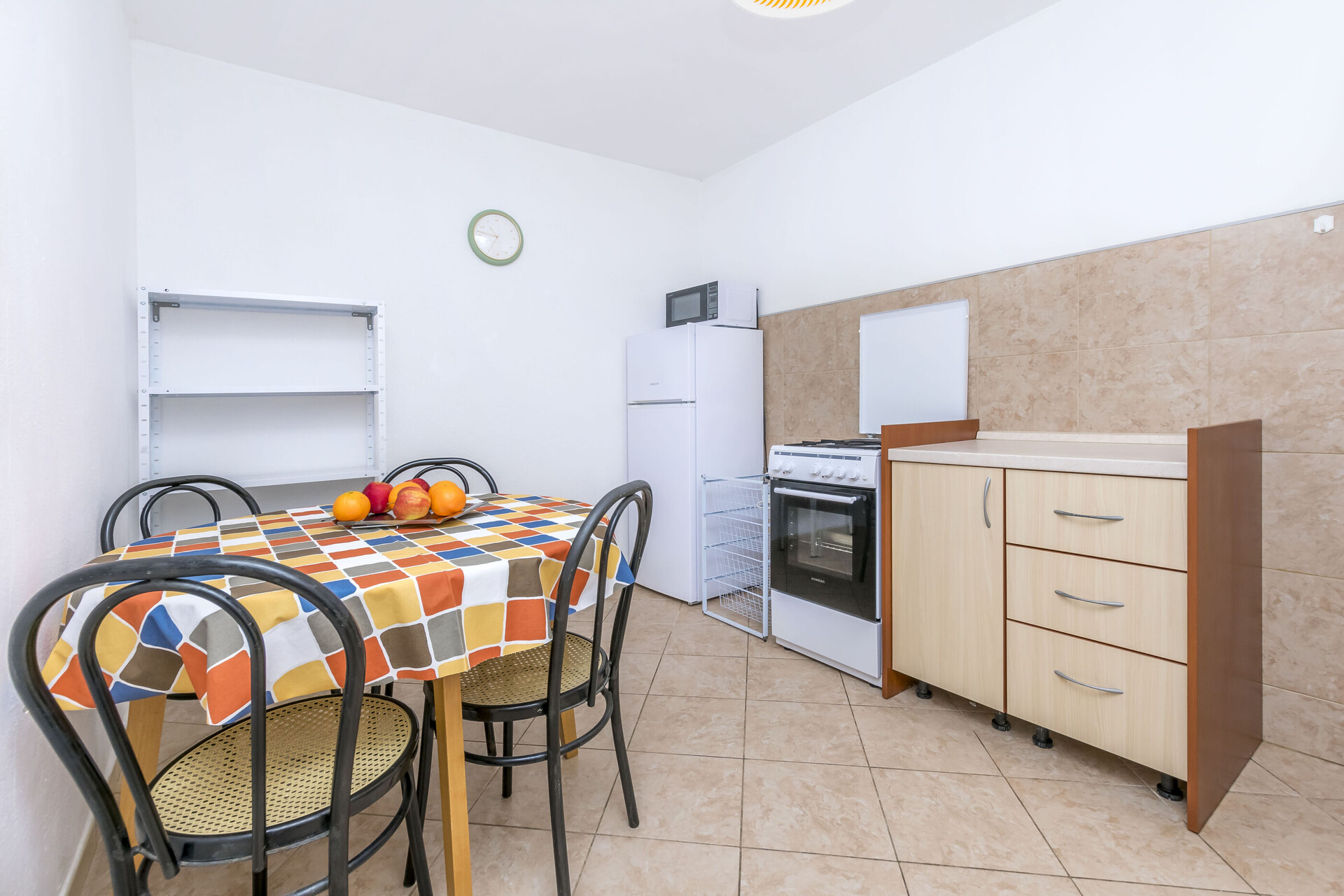• table and chairs, kitchen sink, oven, refrigerator, upright freezer, electric kettle, filter coffee machine, microwave oven, toaster, iron, stove cooktop.