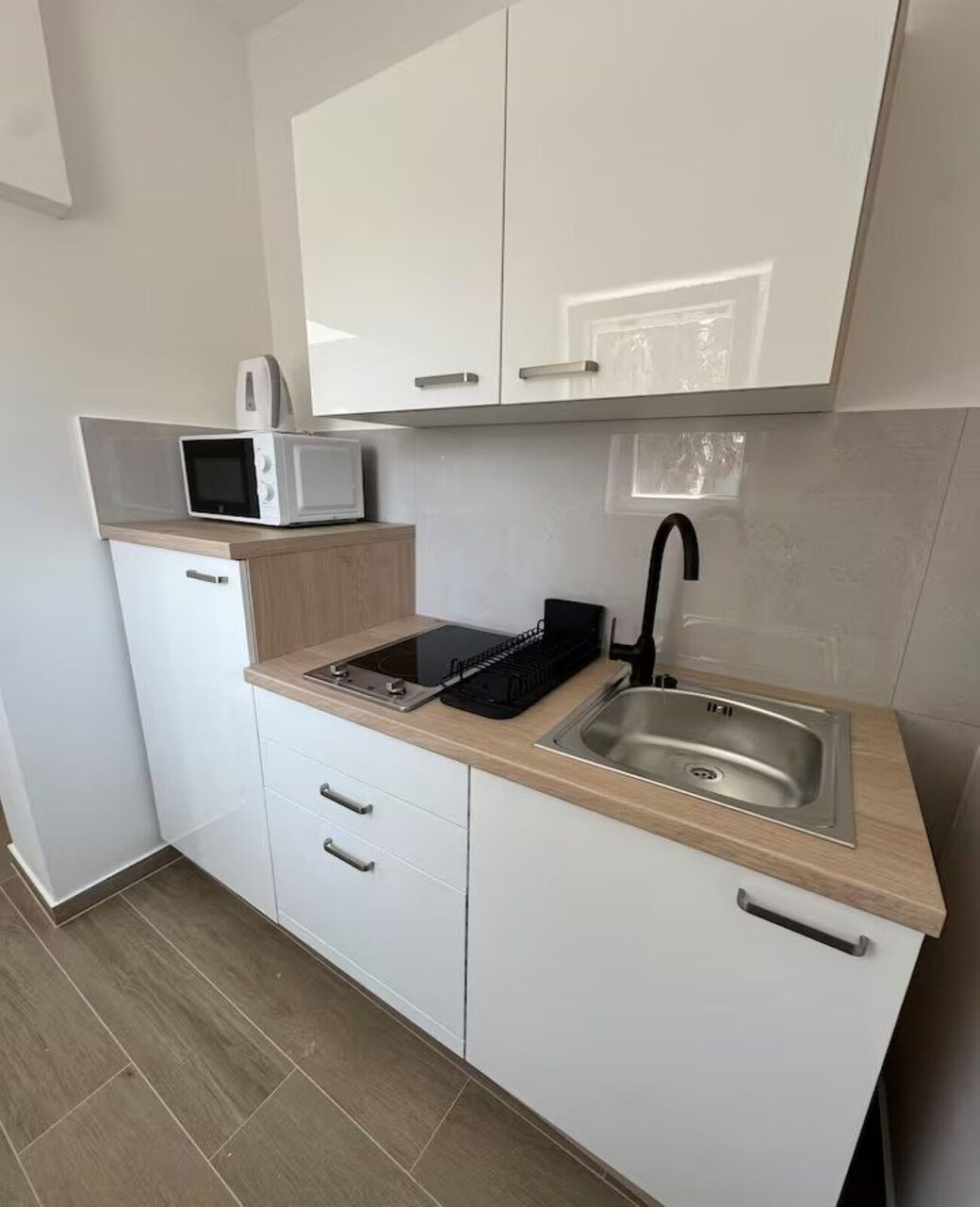 • table and chairs, kitchen sink, refrigerator, electric kettle, microwave oven, stove cooktop.