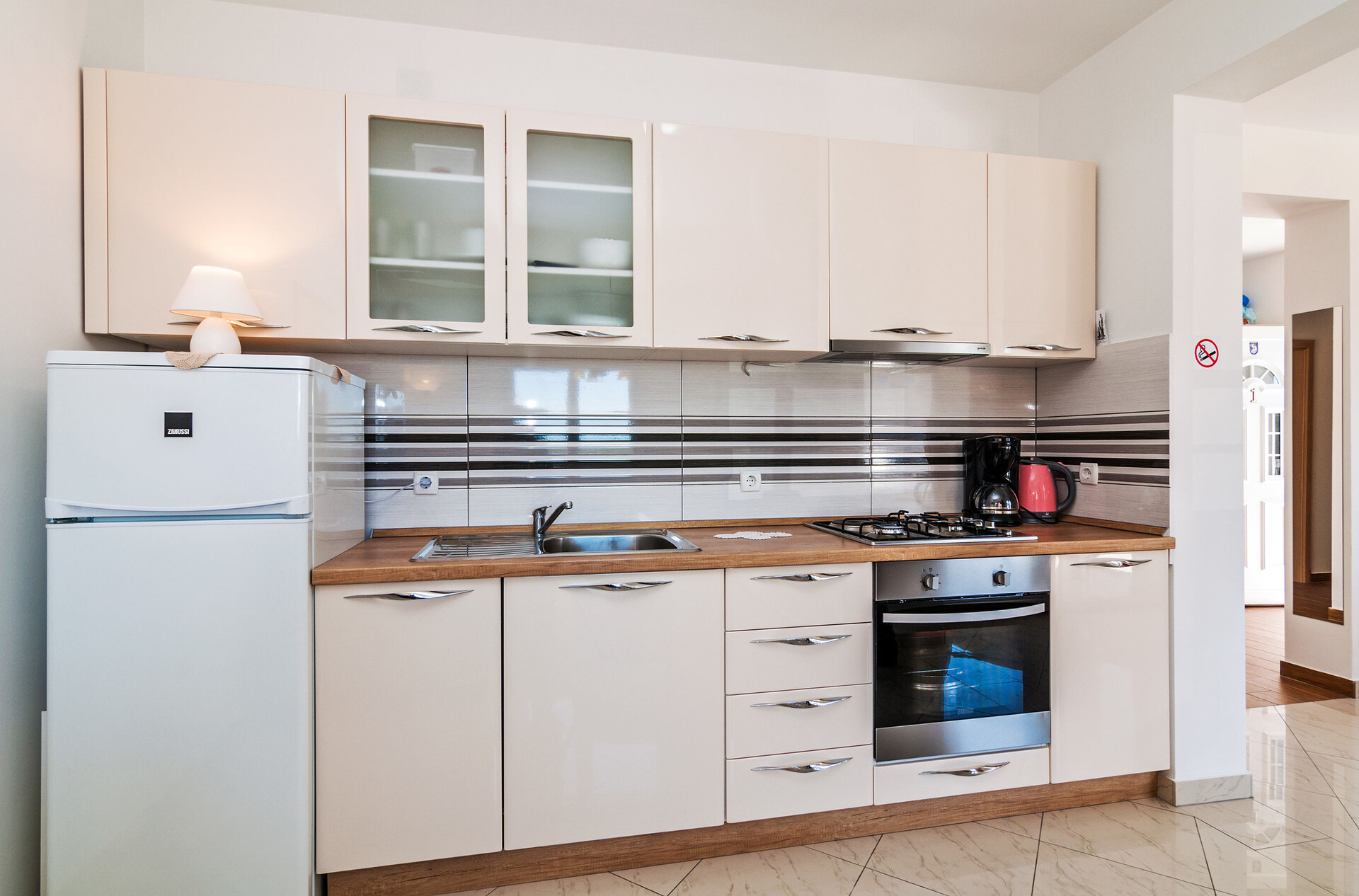 • table and chairs, kitchen sink, oven, refrigerator, electric kettle, filter coffee machine, stove cooktop.