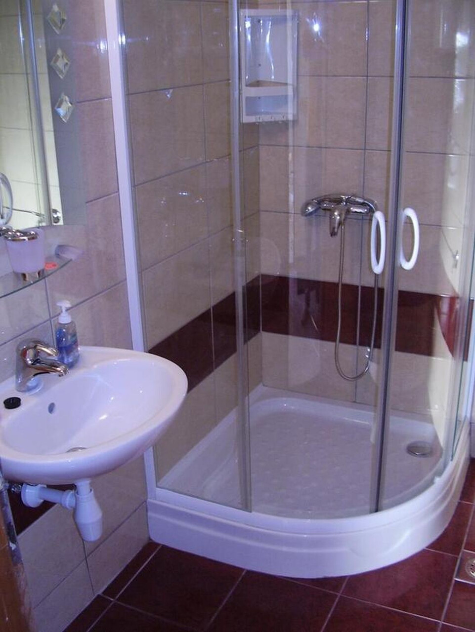 • shower, shower enclosure, washing machine, hairdryer, towels.