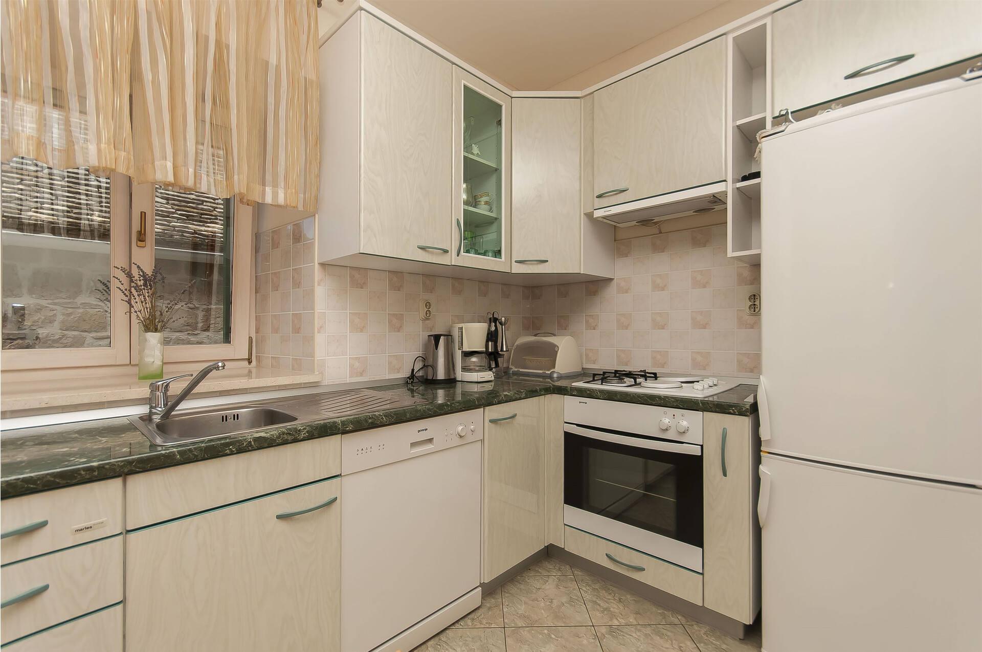 • stůl a židle, dřez, trouba, lednička, mražák, varná konvice, toaster, myčka na nádobí, žehlička, sporák varná deska.