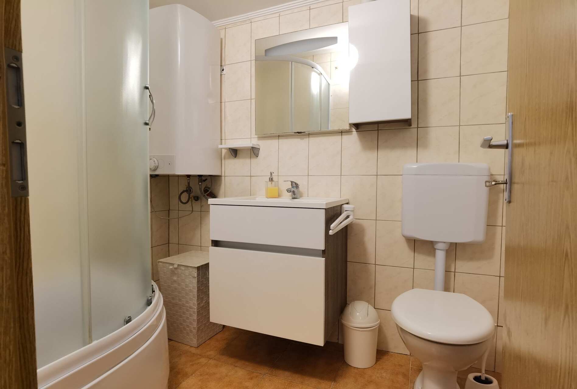 • sprcha, sprchový kout, pračka, fén, ručníky.