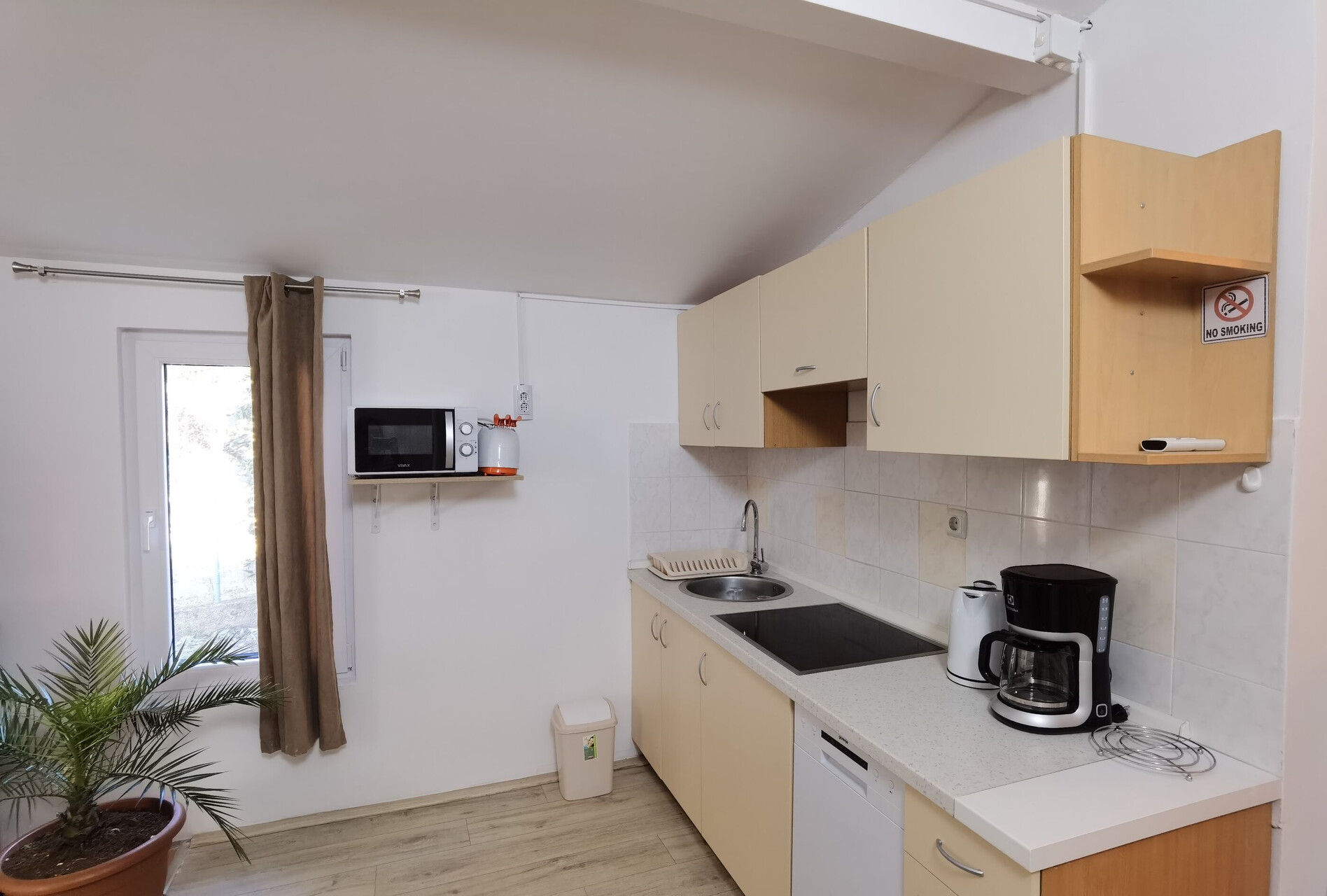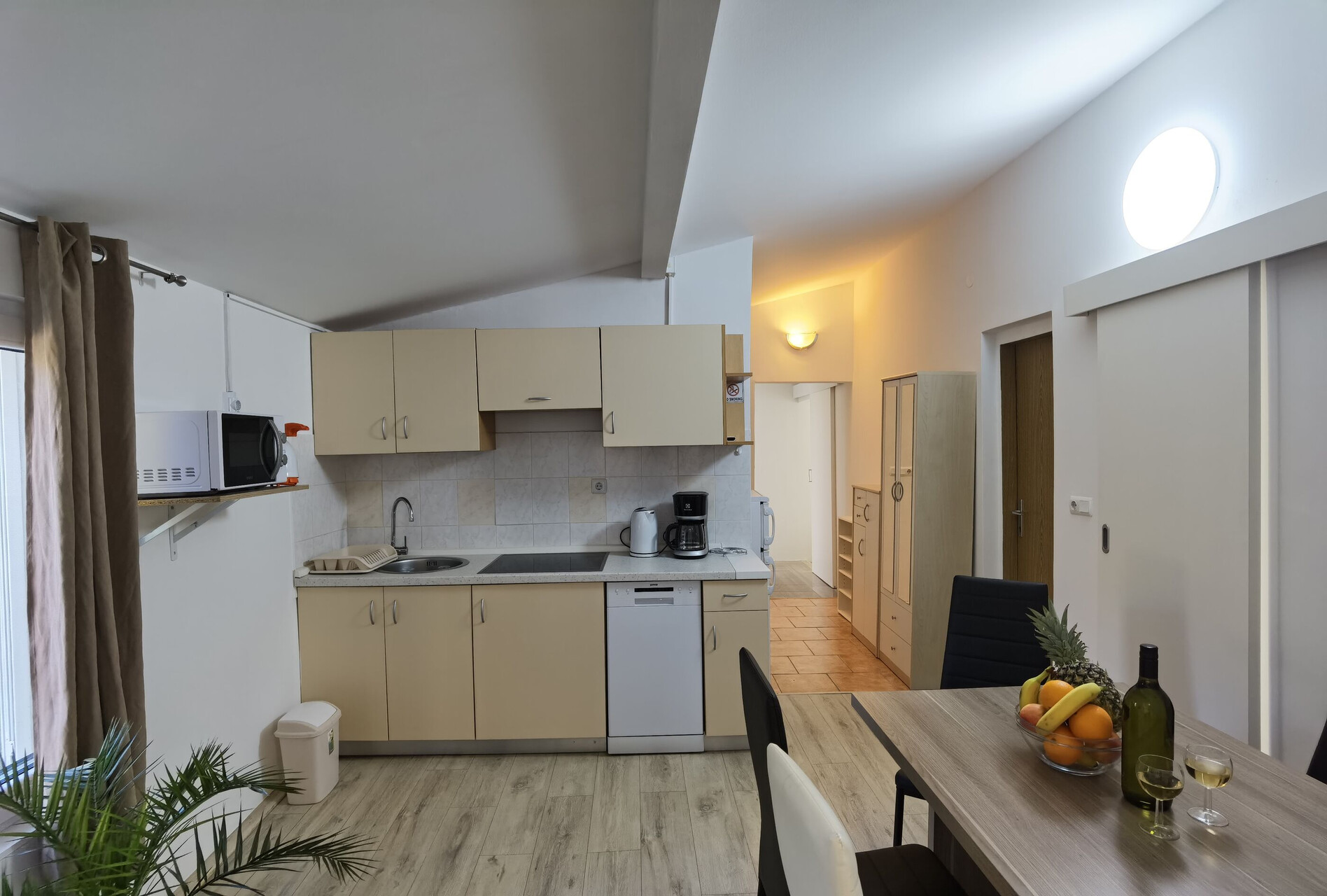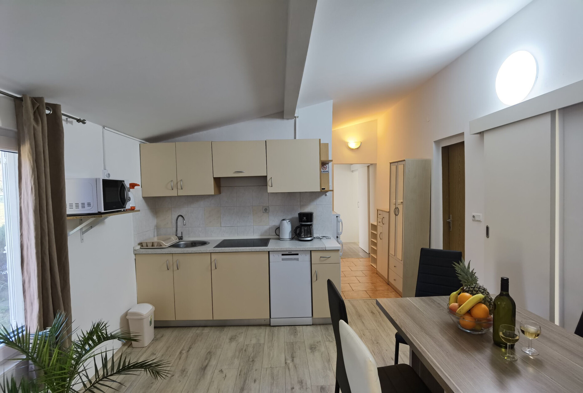 • stůl a židle, dřez, lednička, mražák, varná konvice, kávovar, Mikrovlná trouba, myčka na nádobí, žehlička, sporák varná deska.