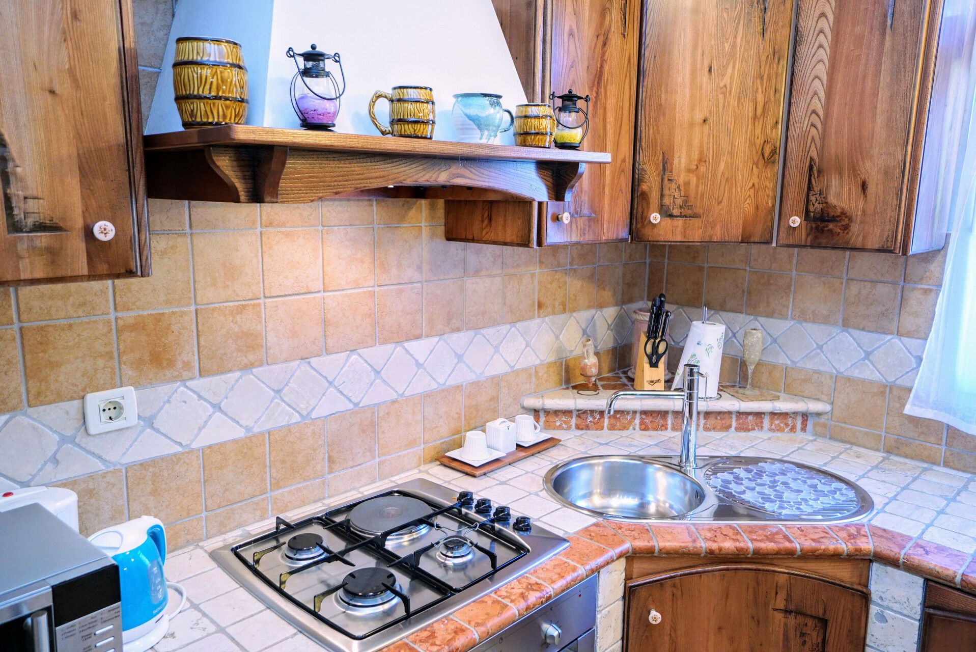 • stůl a židle, dřez, trouba, lednička, mražák, varná konvice, sporák varná deska.