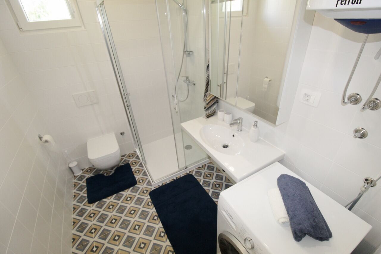 • sprcha, sprchový kout, pračka, fén, ručníky.