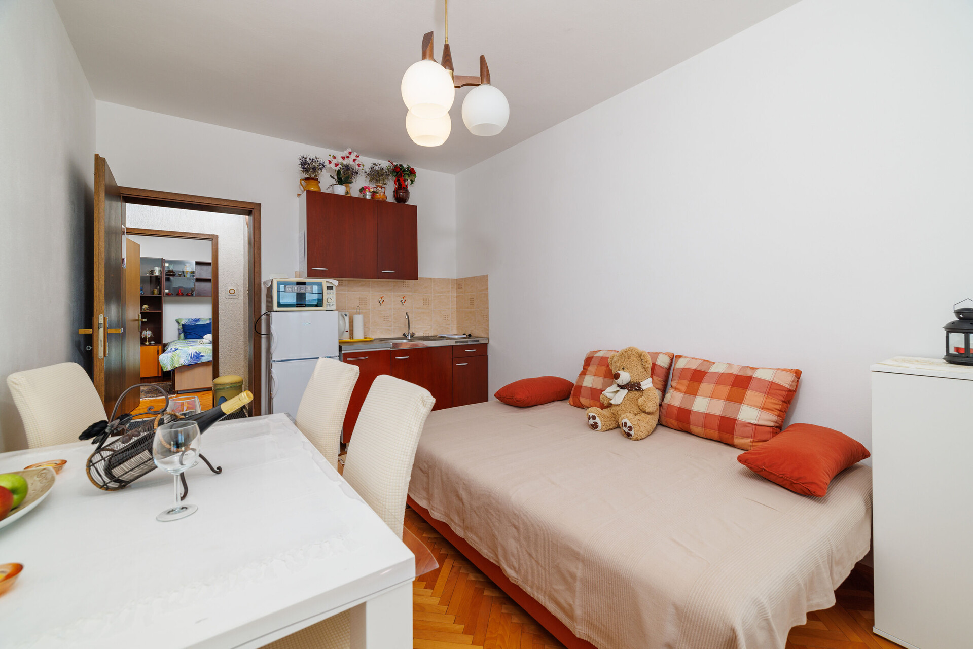 • stůl a židle, dřez, lednička, mražák, kávovar, toaster, žehlička, sporák varná deska.