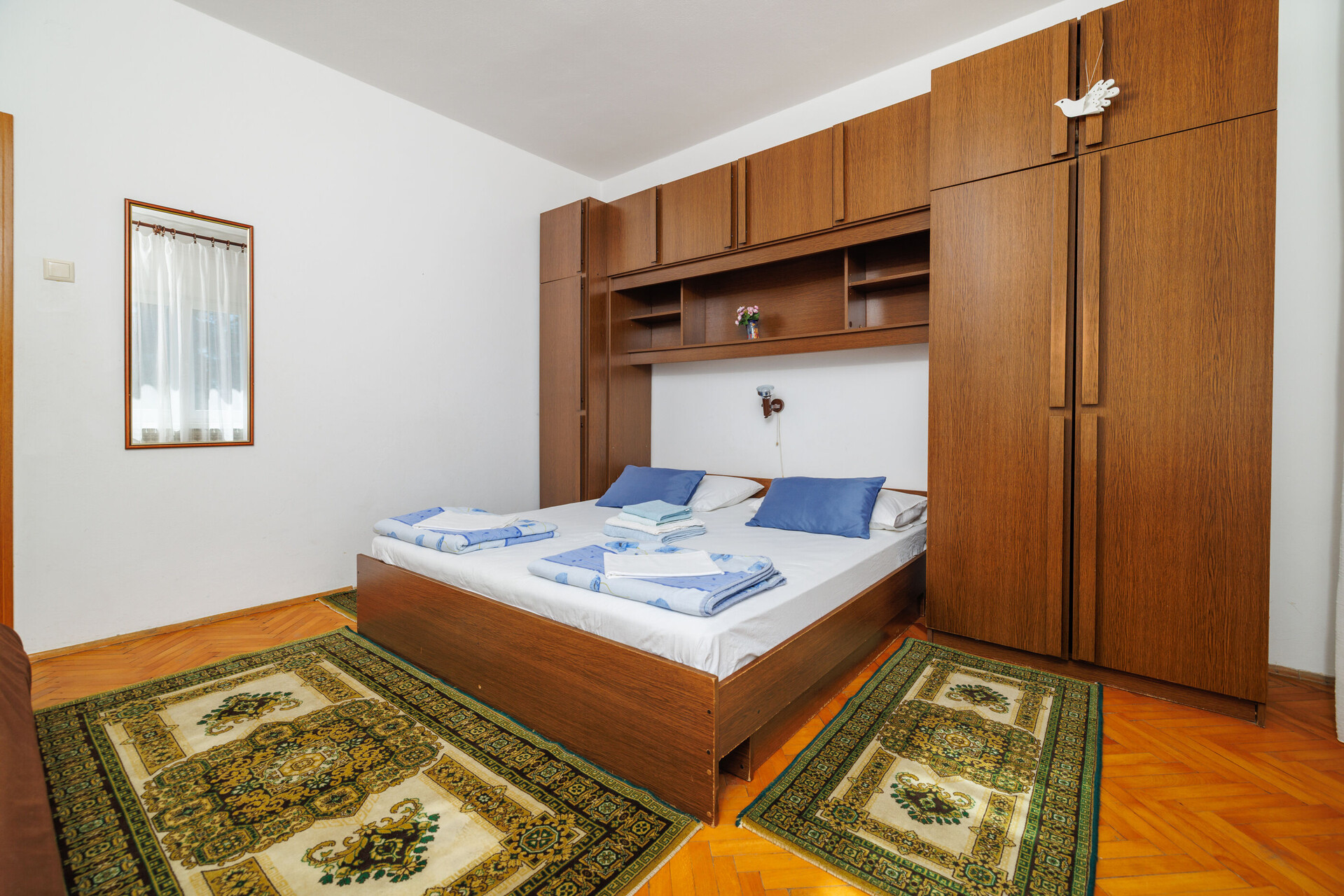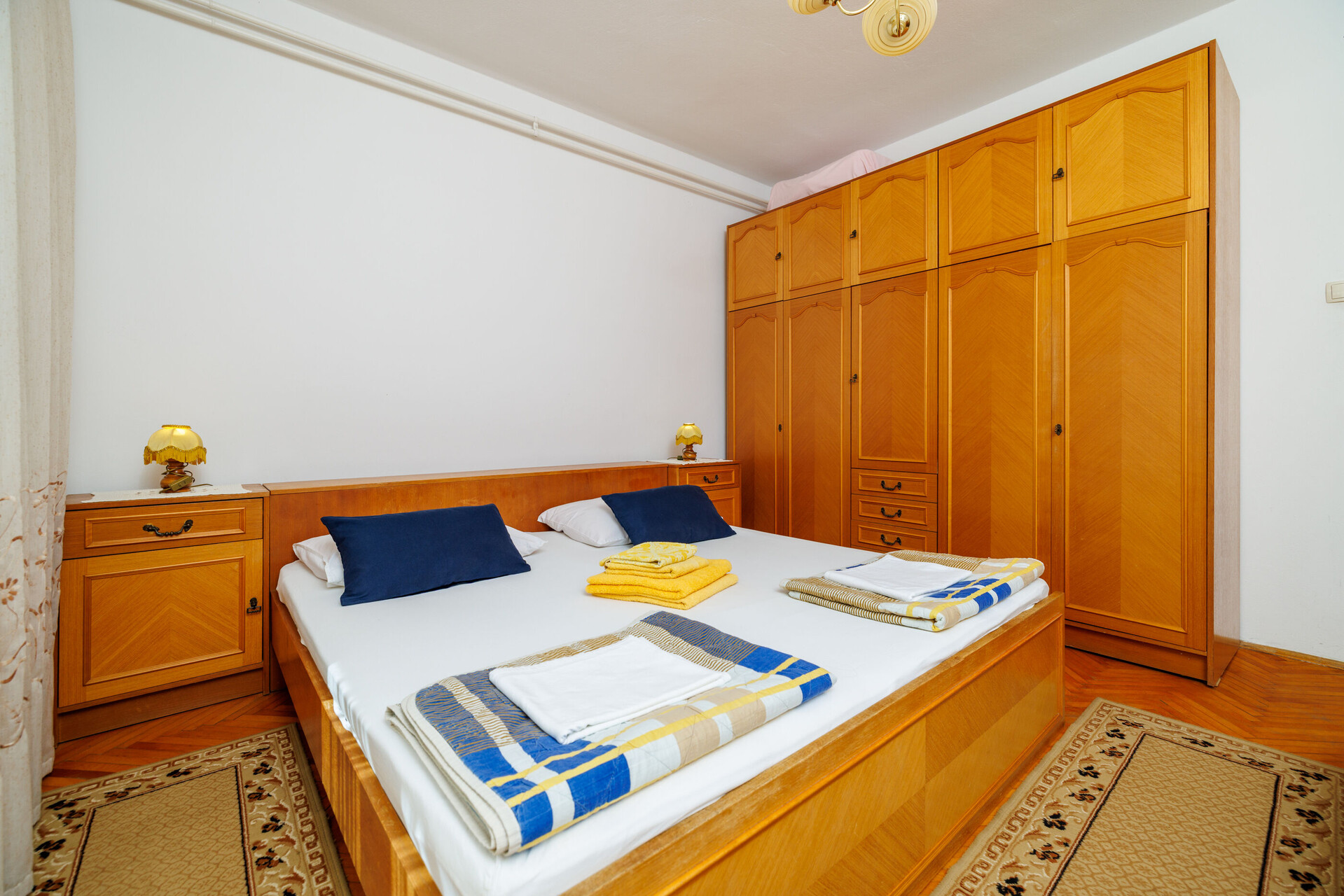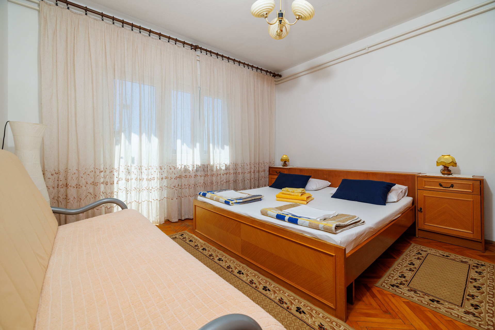 • Postele: manželská postel. Ložní prádlo je k dispozici. Z pokoje se vychází na balkon.