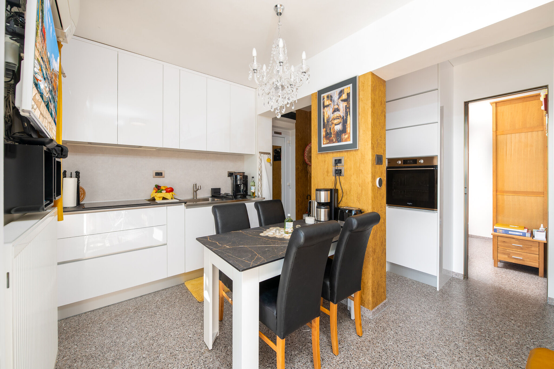 • stůl a židle, dřez, trouba, lednička, mražák, varná konvice, kávovar, Mikrovlná trouba, toaster, myčka na nádobí, žehlička, sporák varná deska.