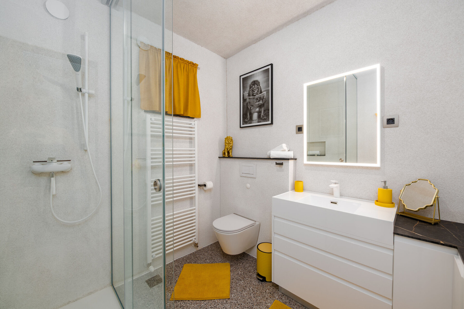 • sprcha, sprchový kout, fén, ručníky.