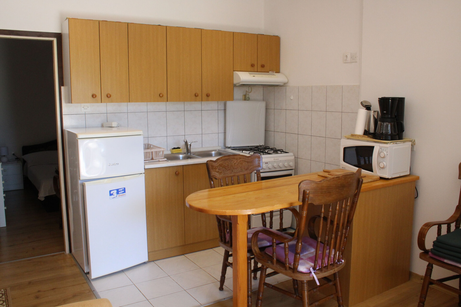 • stůl a židle, dřez, trouba, lednička, mražák, varná konvice, kávovar, myčka na nádobí, sporák varná deska.